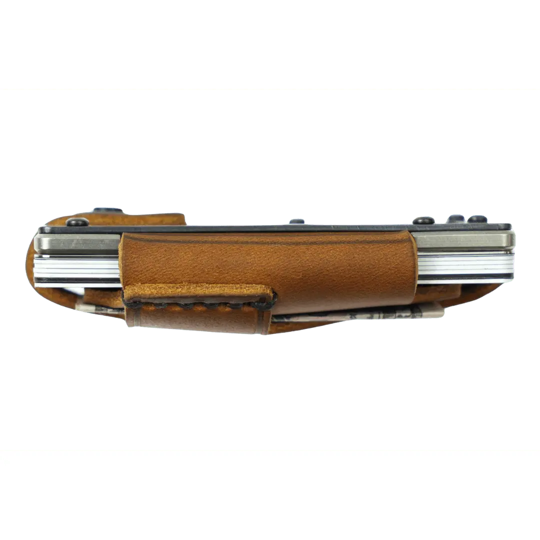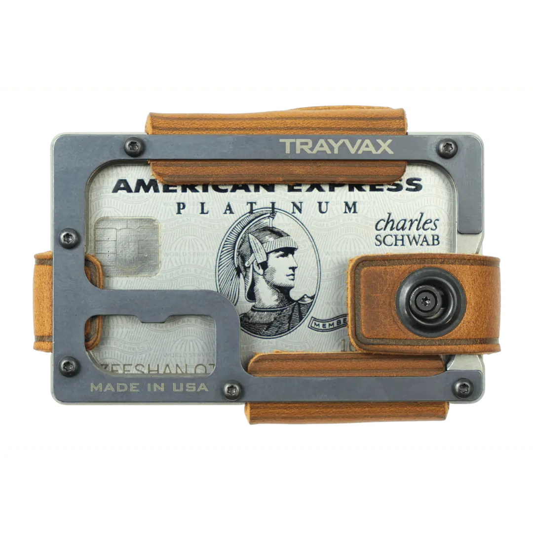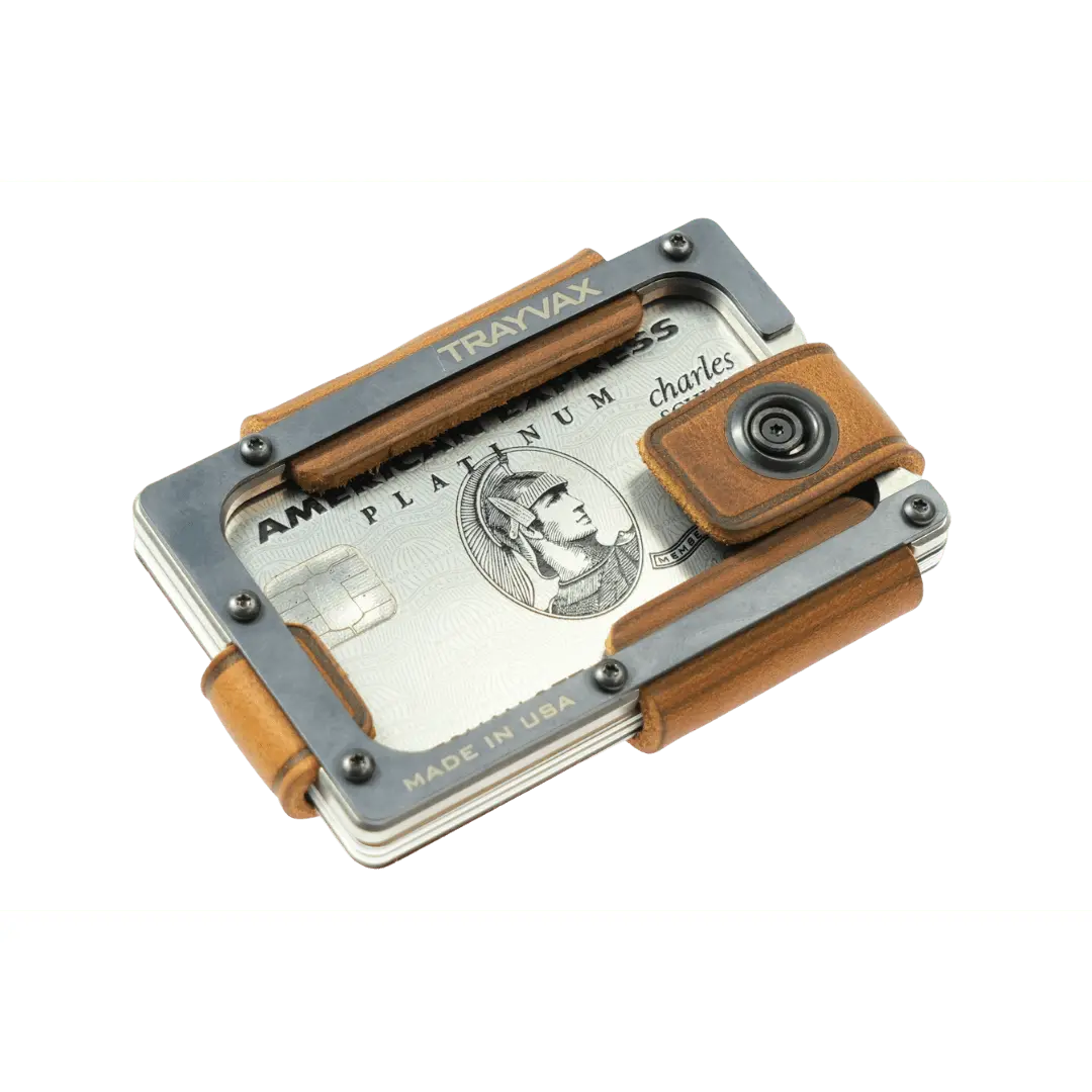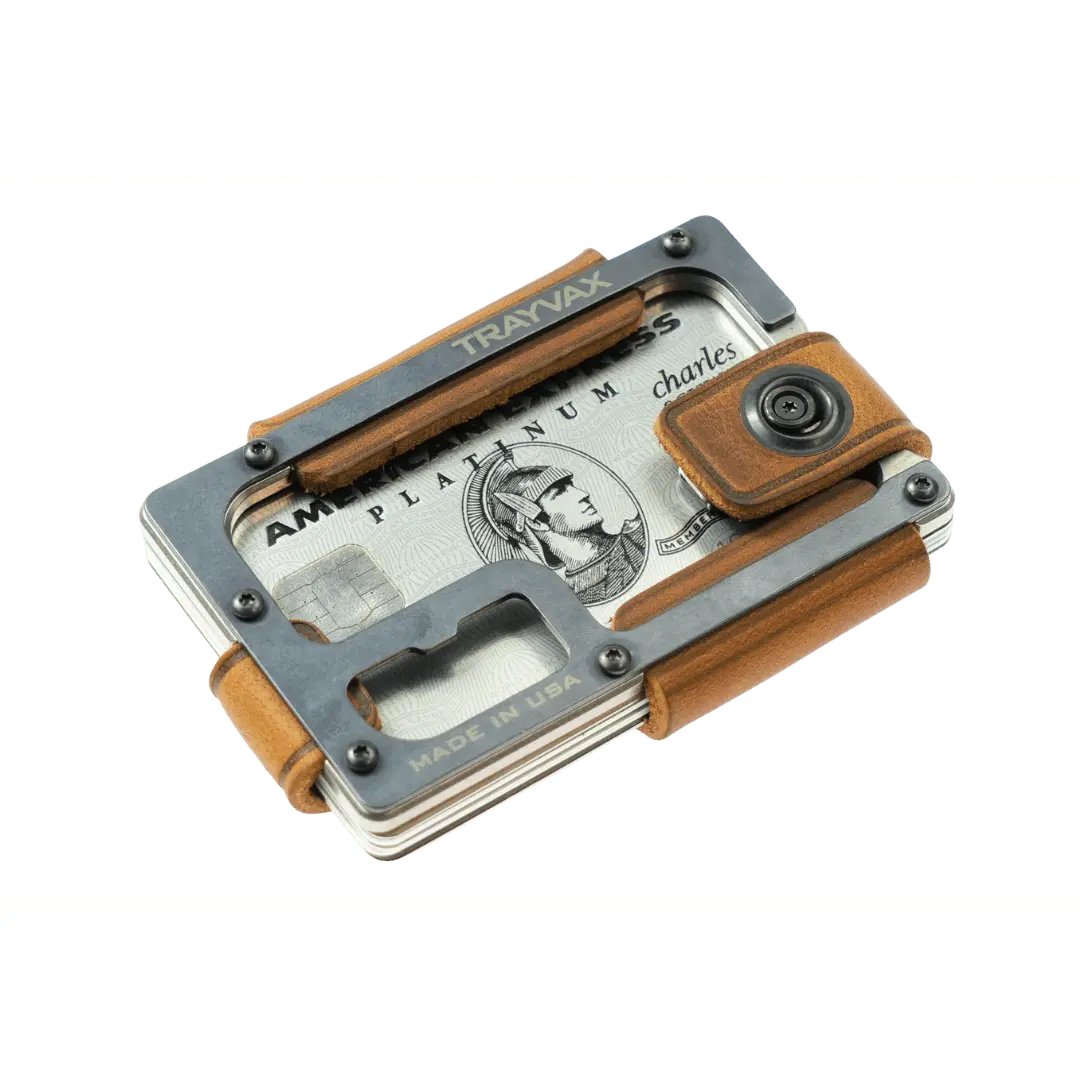 The Trayvax Contour is our most refined leather wallet to date. The bottom plate is highly-precise CNC-machined stainless steel. The top plate is PVD-coated for durability. Each plate is wrapped in top-grain oil-tanned leather, which will develop a patina as a constant reminder of your journey. Ideal for use as a front-pocket wallet, the sleek design and slim profile ensure a compact and lightweight everyday carry.