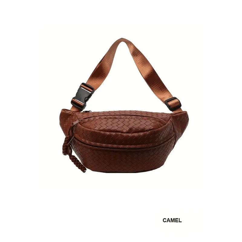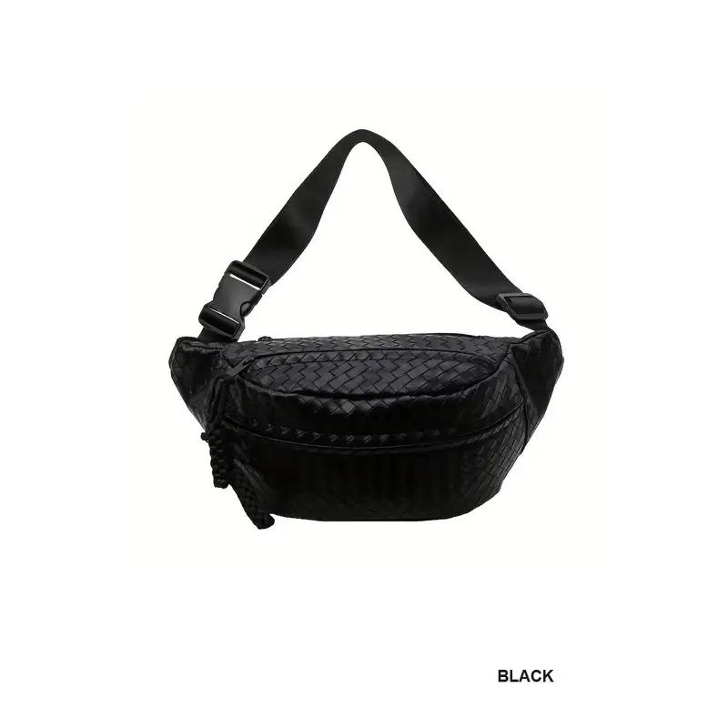 VEGAN LEATHER WOVEN ATLAS CROSSBODY BUM BAG - UNIQUE LUXURY WOVEN DESIGN - ADJUSTABLE STRAP - WATER RESISTANT - VERSATILE WEARING OPTIONS - STYLISH, MODERN AND DURABLE HARDWARE - PERFECT FOR ON-THE-GO - HEIGHT: 7.48", LENGTH: 14.57", WIDTH: 3.93"