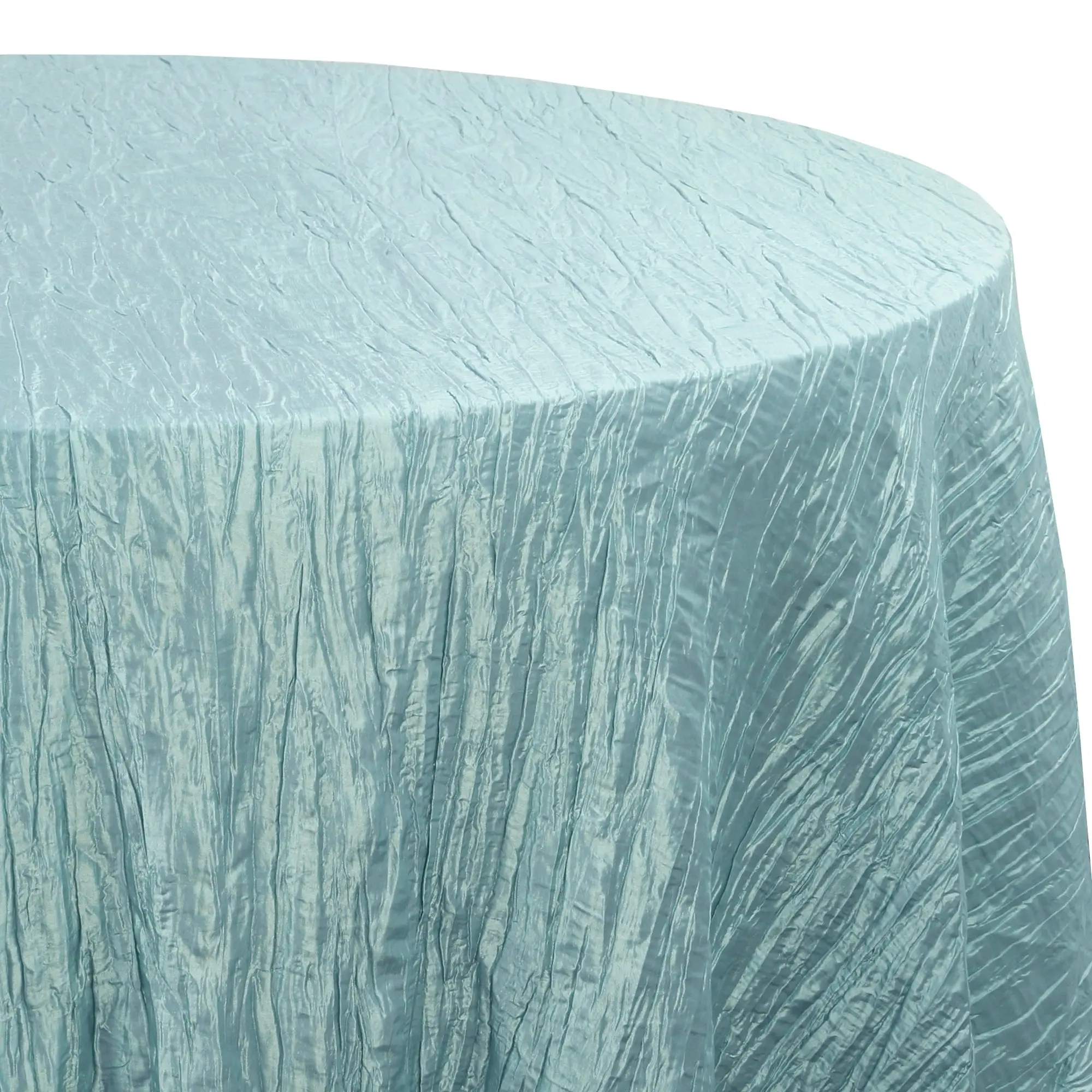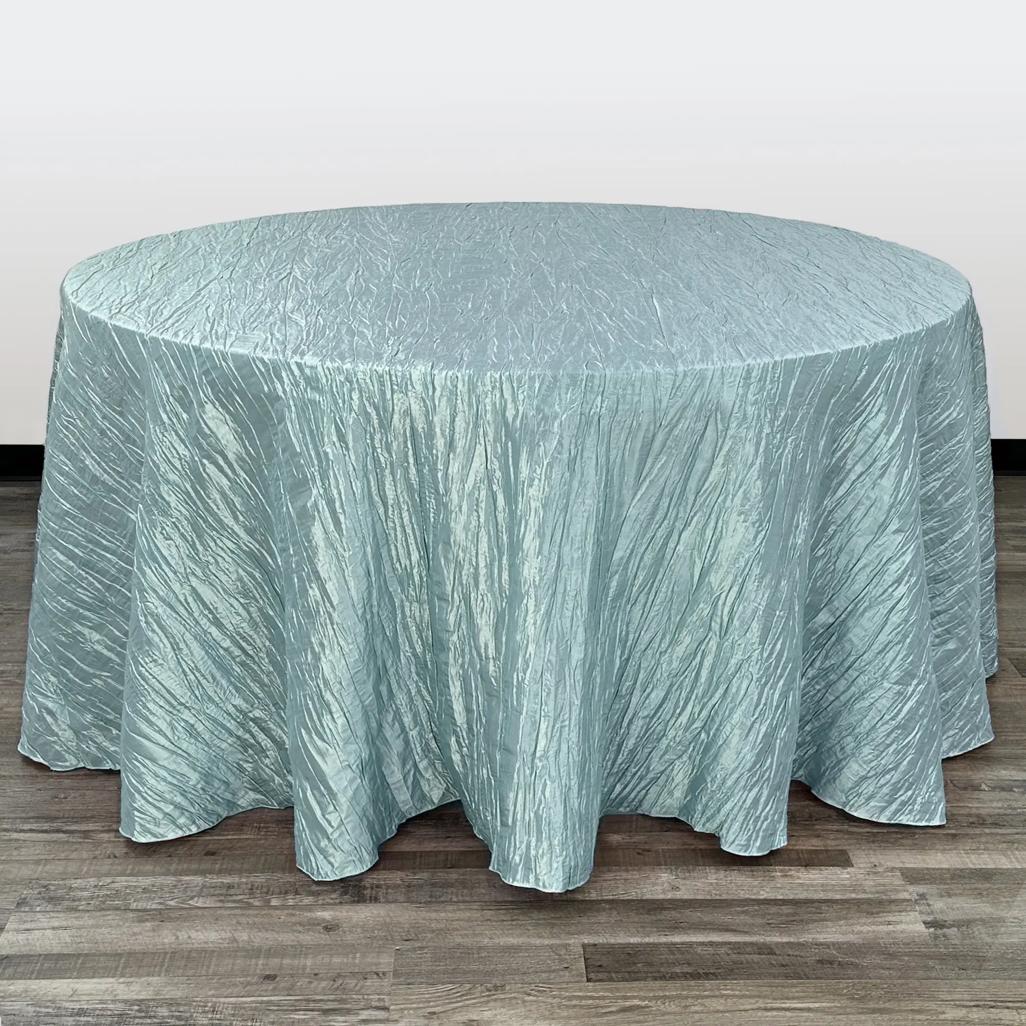 Unique, classy, and sophisticated. This is how most people would describe our 132-inch Crinkle Taffeta Round Tablecloths in Dusty Blue. If you are styling a wedding or special event that calls for exquisite designs and modern elegance, our dusty blue crinkle taffeta table linen for wedding reception tables will definitely fit the bill. When used to complement your wedding chair covers or as a wedding reception hall accent, the textured look of crushed or crinkle dusty blue taffeta will definitely help make a stylish statement. This taffeta tablecloth that fits 72-inch round tables or 6 ft round table sizes is one of our specialty linens here at Bridal Tablecloths.
