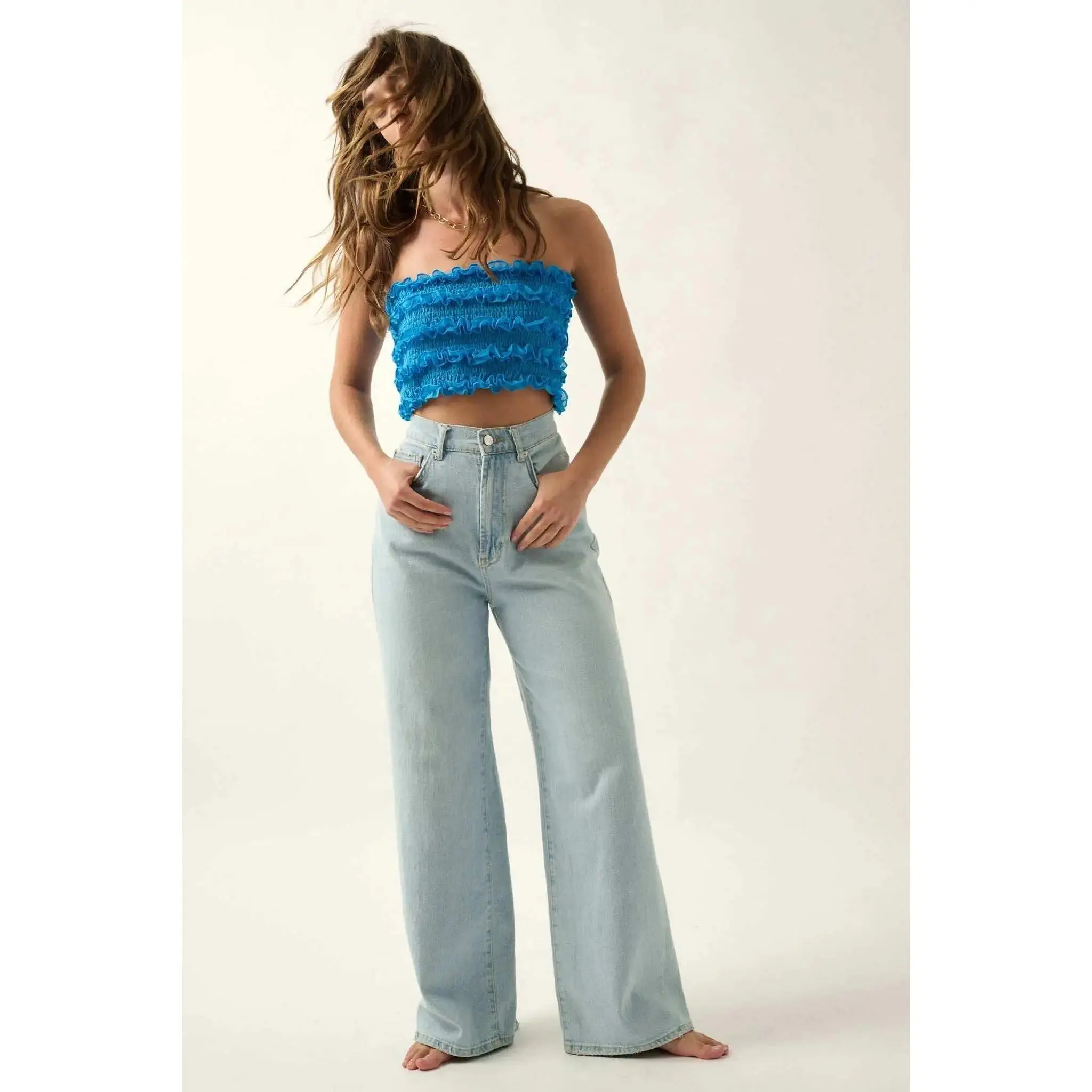 Smocked ruffles, breezy vibes! This crepe chiffon tube top features a smocked bodice, ruffle trim, and a fitted crop. Style it with high-waisted shorts for a festival or a skirt for a fun summer day out.