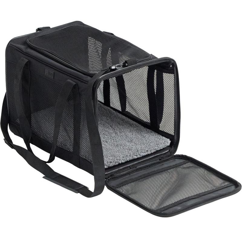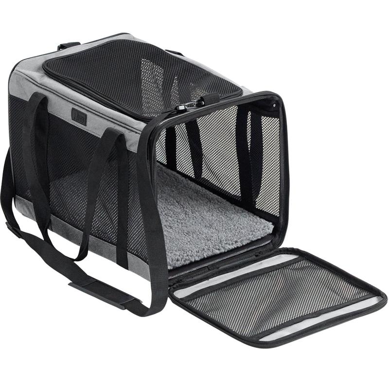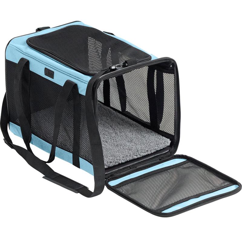 DURABLE CARRIER WITH TWO OPENINGS AND SIDE POCKET: Durable yet lightweight travel bag designed for convenient traveling with pets; 2 openings for easy entry and exit, one at the top and one at the side; sturdy structured frame helps bag keep it shape