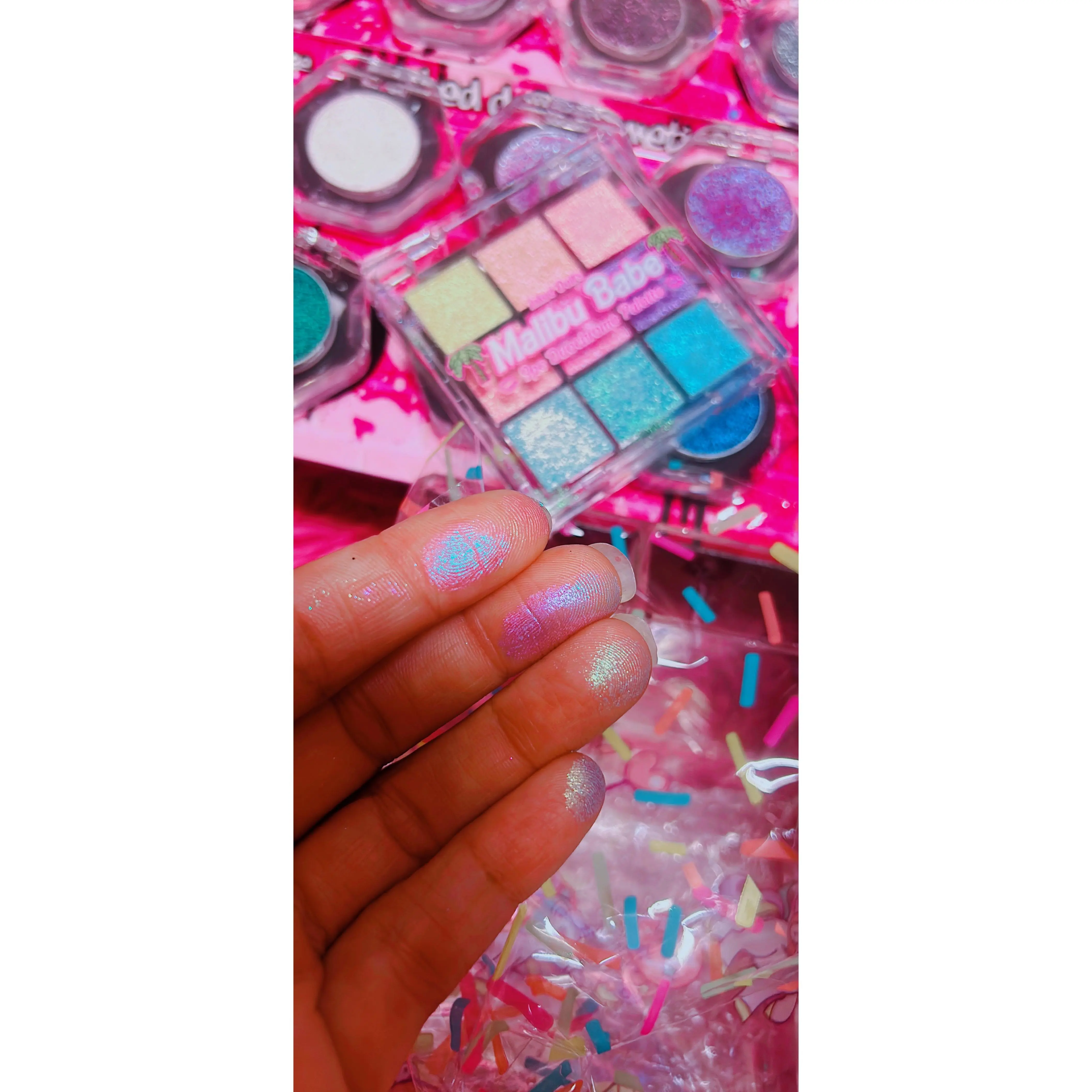 With its light reflecting highly pigmented multichrome hues, the “Malibu Babe” palette has captured the aurora of the Malibu Sunrise and Sunset, Oceanic gentle breeze, California Surfers, Sun and Fun & of course all the pretty Barbie Babes in a beautiful 9 pc Duochrome Palette where a little goes a long ways;)