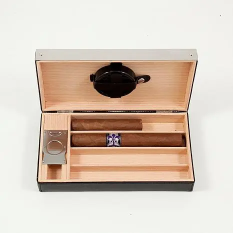 Bey-Berk Leather Humidor 4 Cigar Holder Here's the perfect box for your favorite smokes. This sleek four cigar humidor is wrapped in black leather with a handsome stainless steel trim. It includes a plastic humidistat to maintain the optimum humidity inside the box to keep your fine cigars perfectly conditioned. What You Get Wood cigar box with leather cover Stainless steel cigar cutter Plastic humidstat