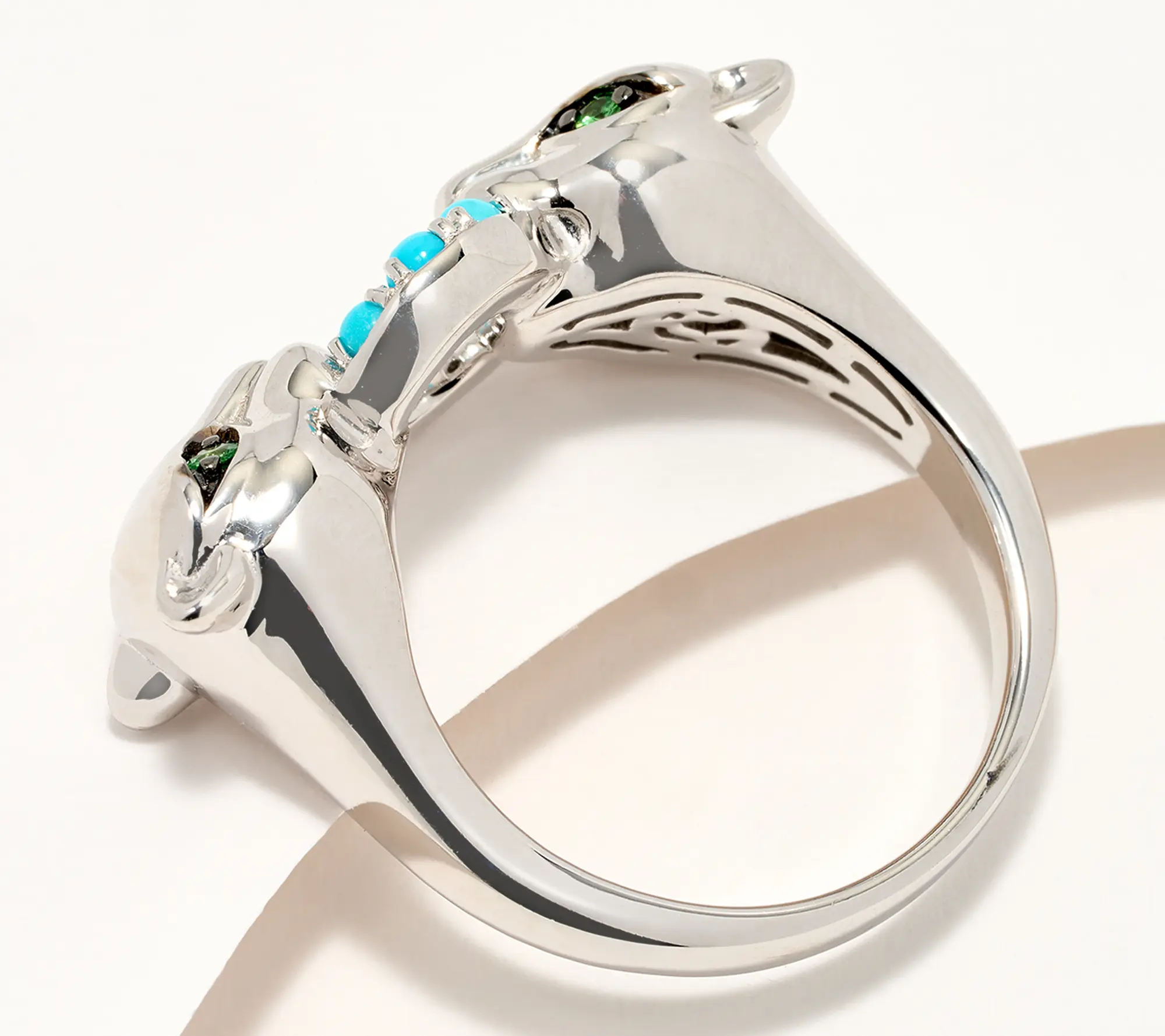 Two-headed panther design, turquoise beads and tsavorite gemstones; polished finish
