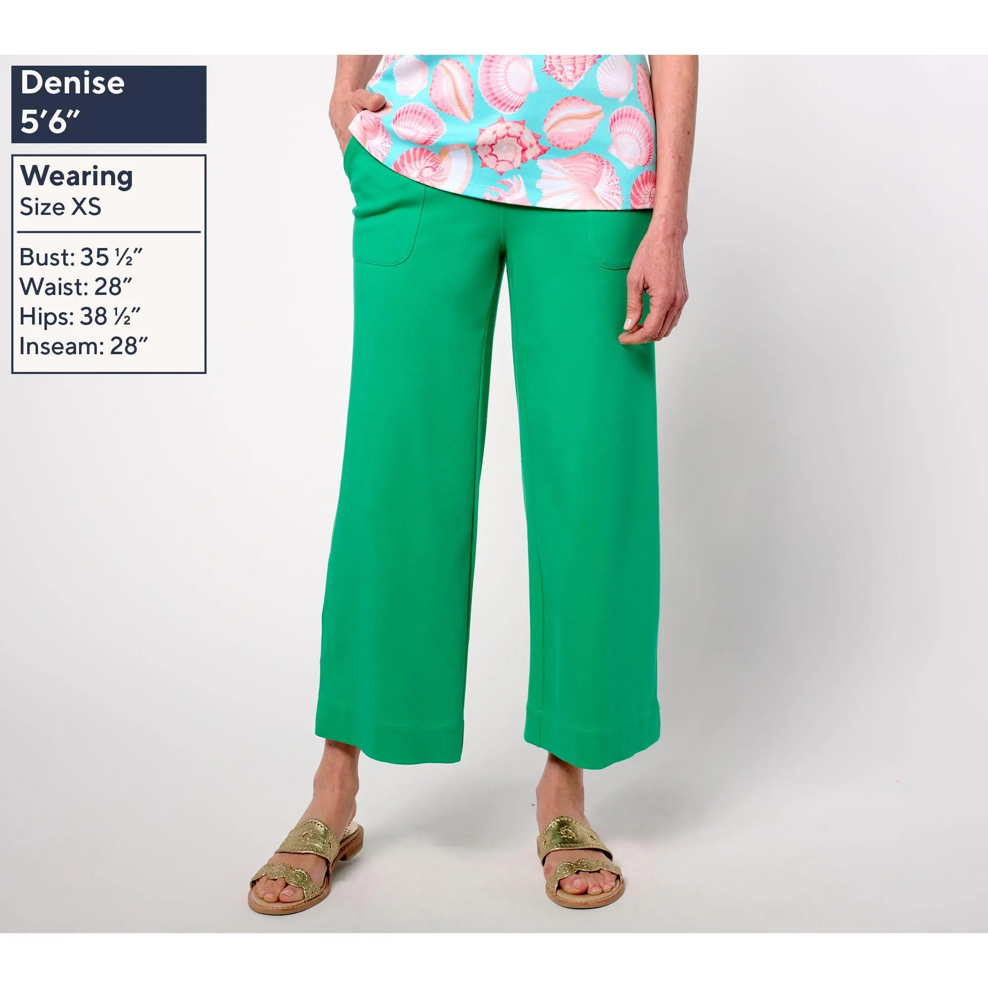 ·Features: encased elastic waistband, slash front pockets, culotte length