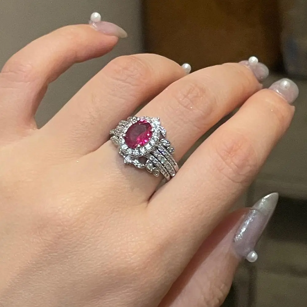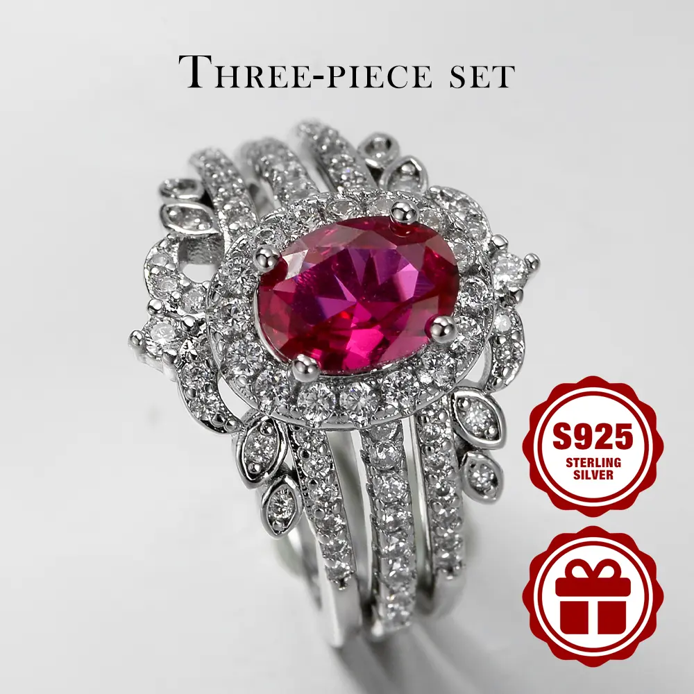 925 sterling silver three-piece set ring for women, red oval zirconia setting, suitable for ladies, for daily wear, wedding, as a gift for girlfriend, with gift box