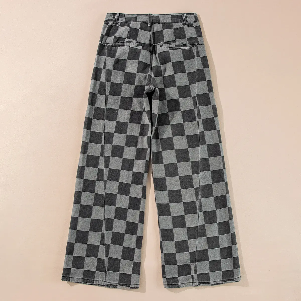 Mntaor Women's Plaid Print Wide Leg Jeans
