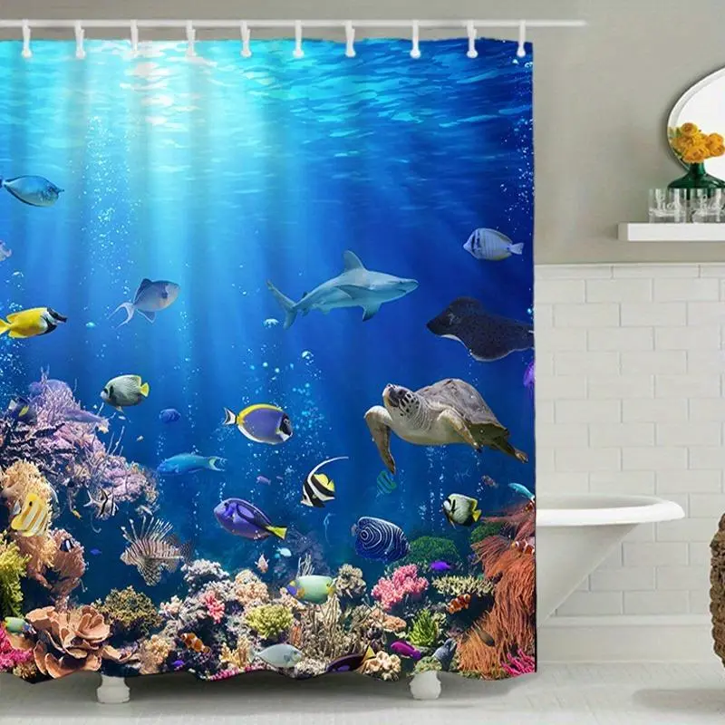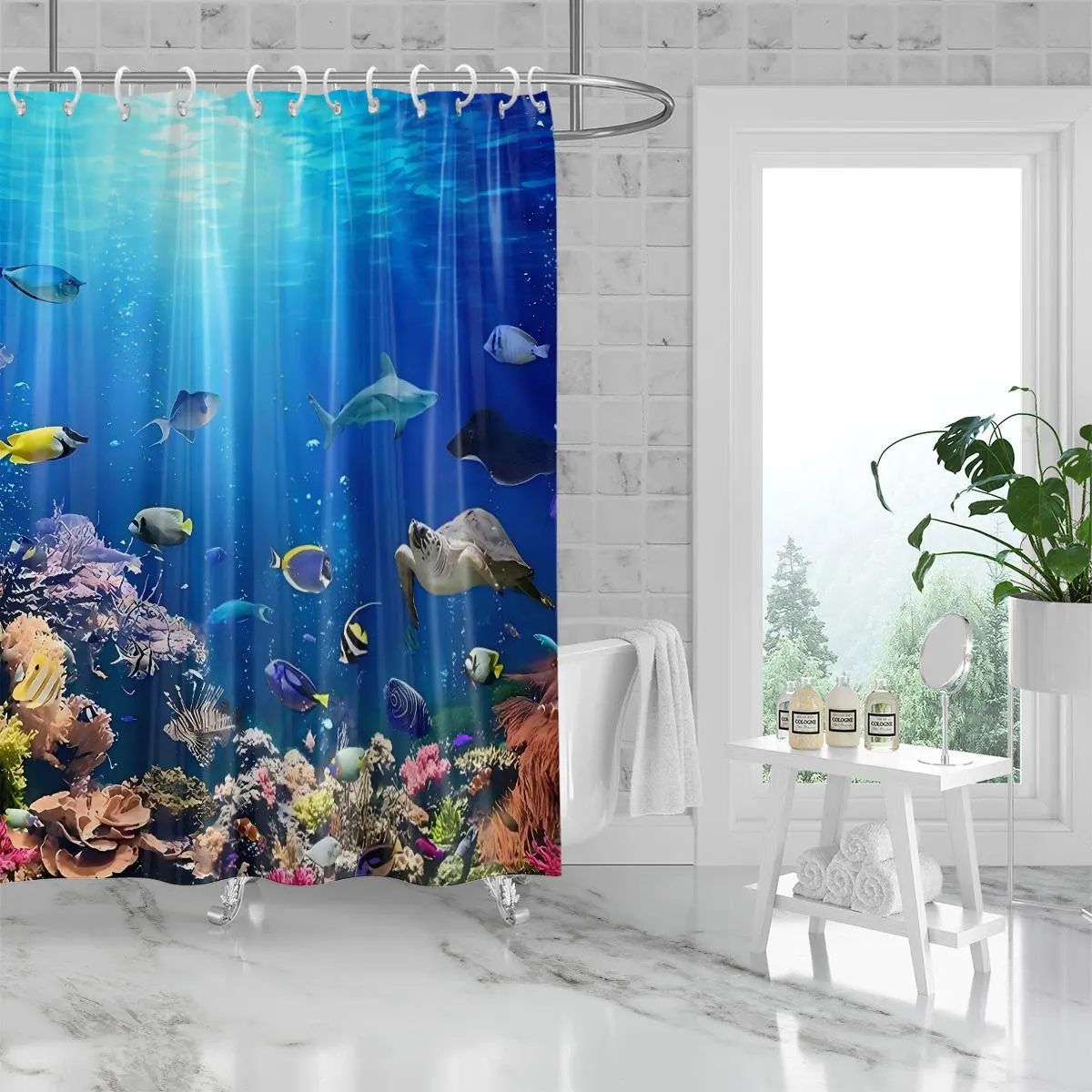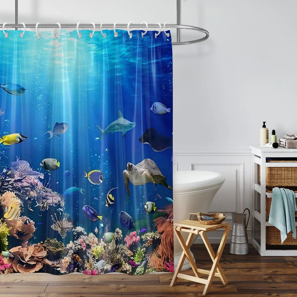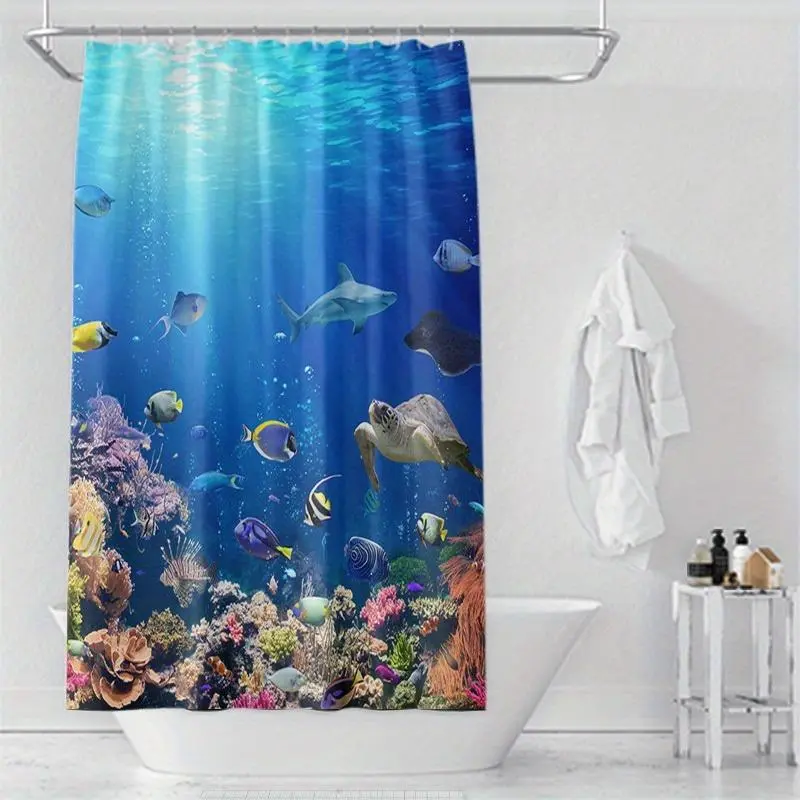 Underwater World Fish & Coral Reef Pattern Waterproof Shower Curtain, 1 Count Colorful Bathroom Curtain, Bathroom Decoration Supplies for Home Hotel Salon