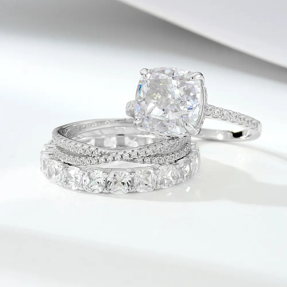 ·Includes: 1× Engagement Ring with Ice Flower Center Stone 1× Pavé Eternity Wedding Band 1× X Criss Cross Wedding Band