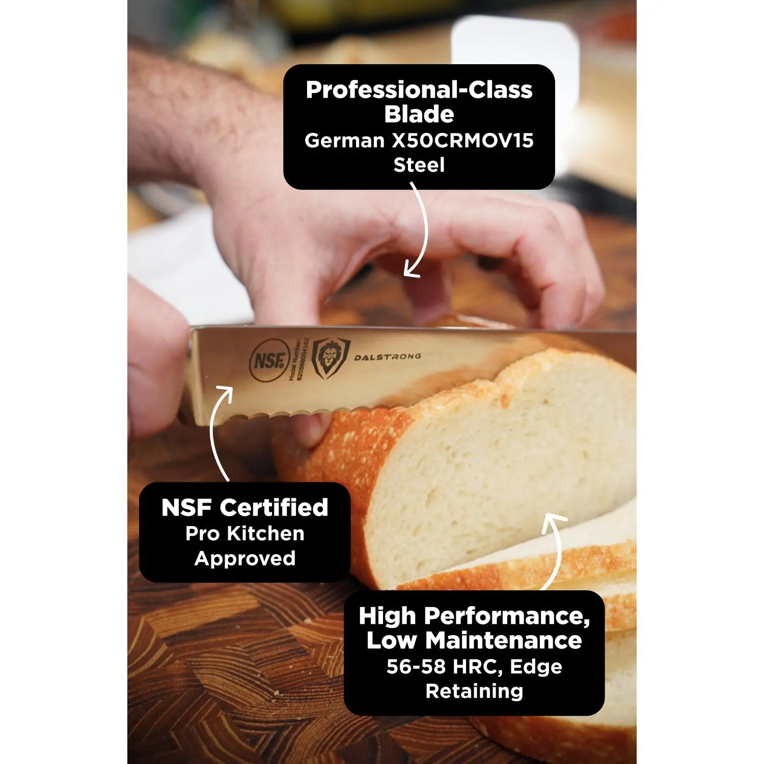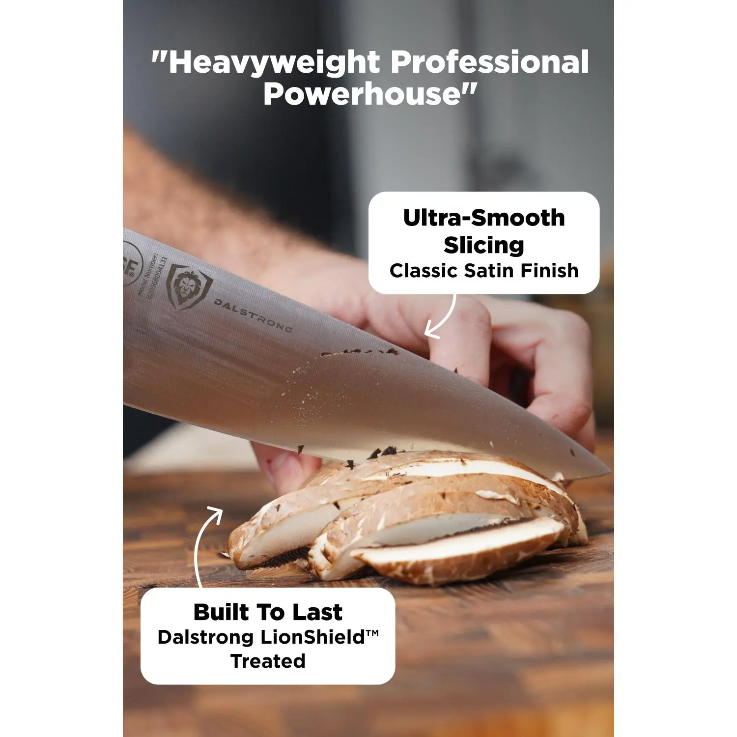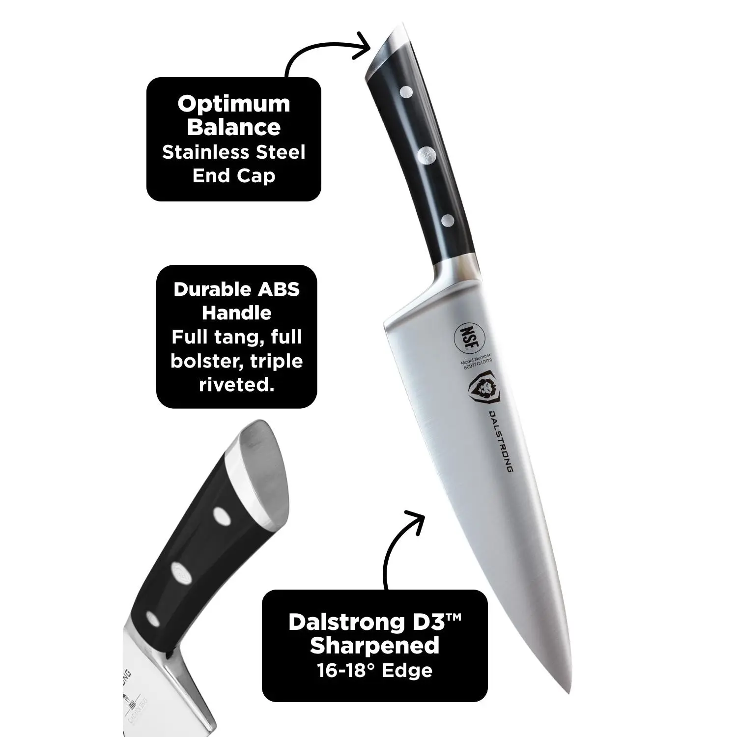 The Gladiator Series is precision forged from a single piece of imported premium quality, high-carbon German steel, ensuring an ultra sharp edge with excellent wear and stain resistance. Hand sharpened 16-18 degrees per side, the Dalstrong Gladiator Series knives is a high performance kitchen workhorse, ensuring ultra-thin slicing and dicing with minimal effort, maintenance or clean up required. A wide blade allows for easy knuckle clearance and the scooping food for transfer from cutting board to pot or pan. Featuring a beautiful, ergonomic and ambidextrous premium food-grade ABS polymer handle hat is highly impervious to heat, cold and moisture.