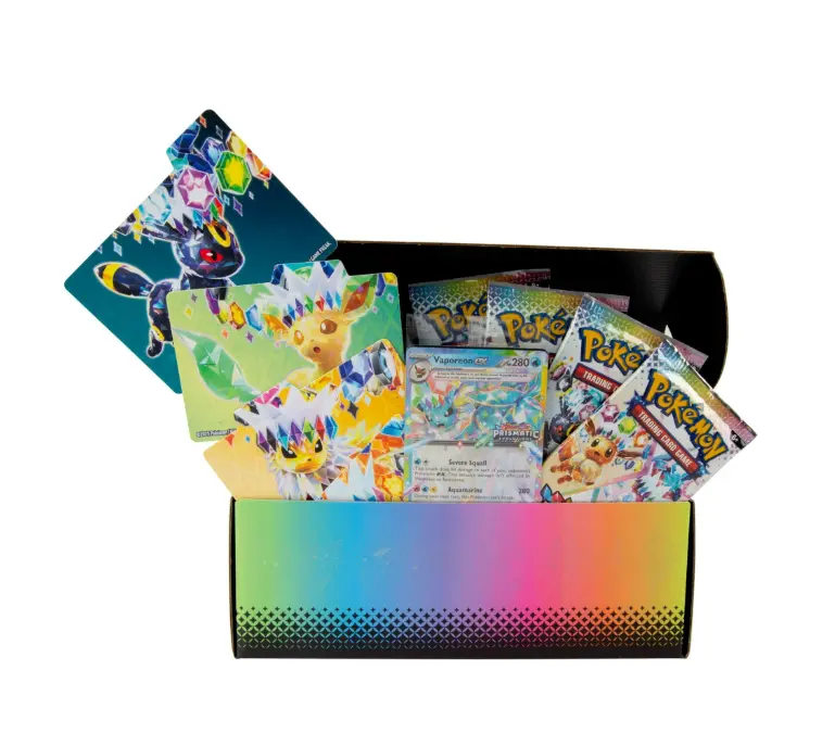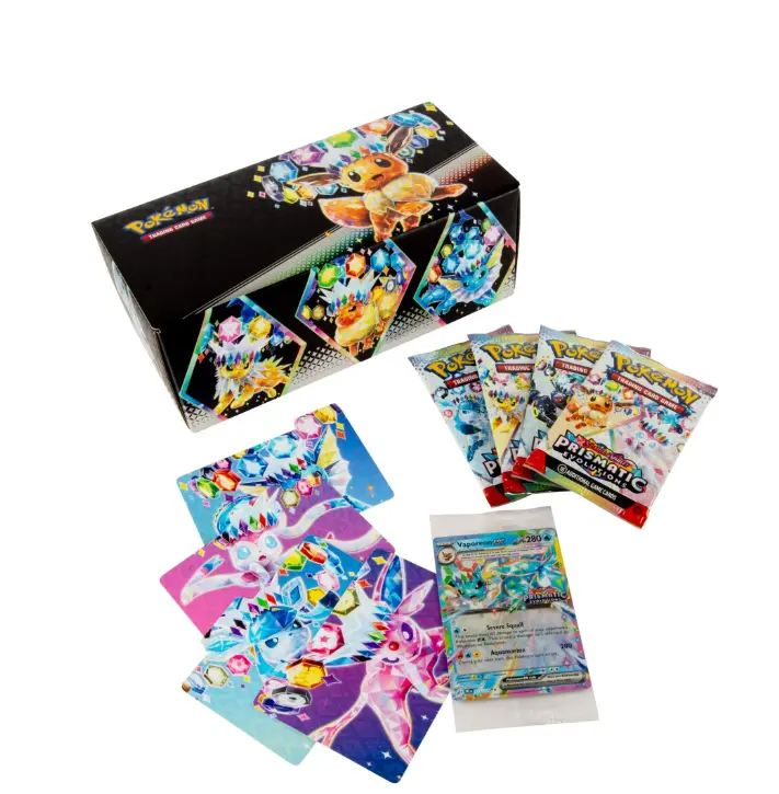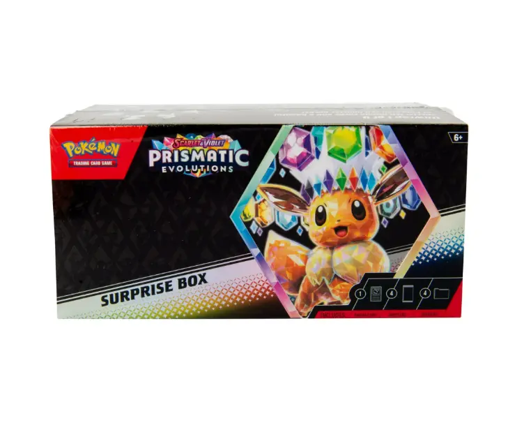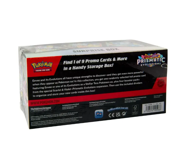 ·Card Text:Find 1 of 9 Promo Cards & More in a Handy Storage Box!Eevee and its Evolutions all have unique strengths to discover—and they get even more powerful when they appear as Pokémon ex! In this collection, you get one randomly selected foil promo card featuring Eevee or one of its Evolutions as a Stellar Tera Pokémon ex, plus four booster packs from the special Scarlet & Violet—Prismatic Evolutions expansion. Then use the included dividers to organize and store your new cards inside this box!Unwrap 1 of 9 special foil promo cards and a handful of Pokémon TCG booster packs!The Pokémon TCG: Scarlet & Violet—Prismatic Evolutions Surprise Box includes:1 of 9 randomly selected foil promo cards with a special logo, featuring Eevee ex, Vaporeon ex, Jolteon ex, Flareon ex, Espeon ex, Umbreon ex, Leafeon ex, Glaceon ex, or Sylveon ex4 Pokémon TCG: Scarlet & Violet—Prismatic Evolutions booster packsEach booster pack contains 10 cards and 1 Basic Energy. Cards vary by pack.A box to hold everything, with 4 dividers to keep it organizedA code card for Pokémon TCG Live