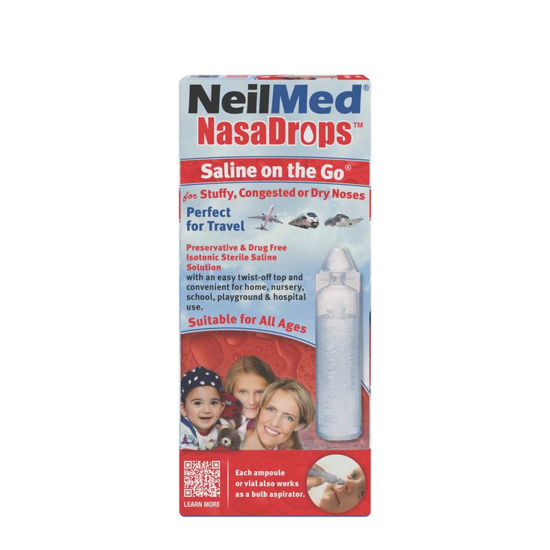 NasaDrops Saline on the Go is a drug-free, preservative-free, sterile nasal saline solution that soothes and moisturizes infants' dry or congested noses. The 15 mL (0.5 oz) ampoules are convenient for home, nursery, school, playground, travel and hospital use. A few drops of saline will moisturize, while squeezing a larger quantity will deliver a gentle nasal rinse. For ages 6 months and up (Ages under 6 months please consult your physician).