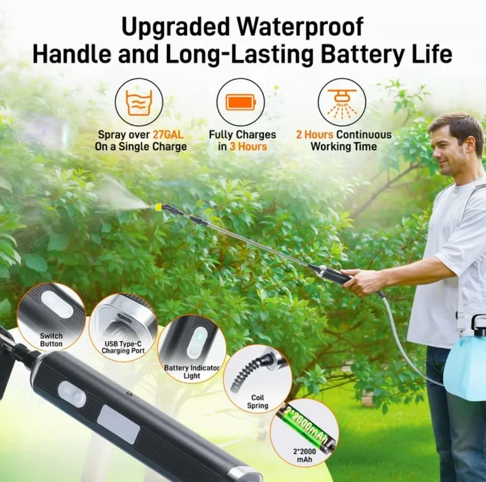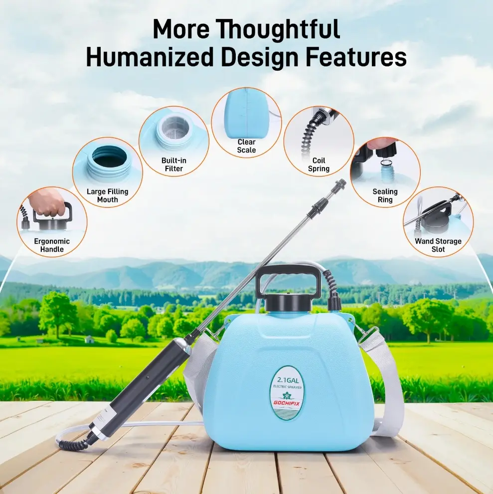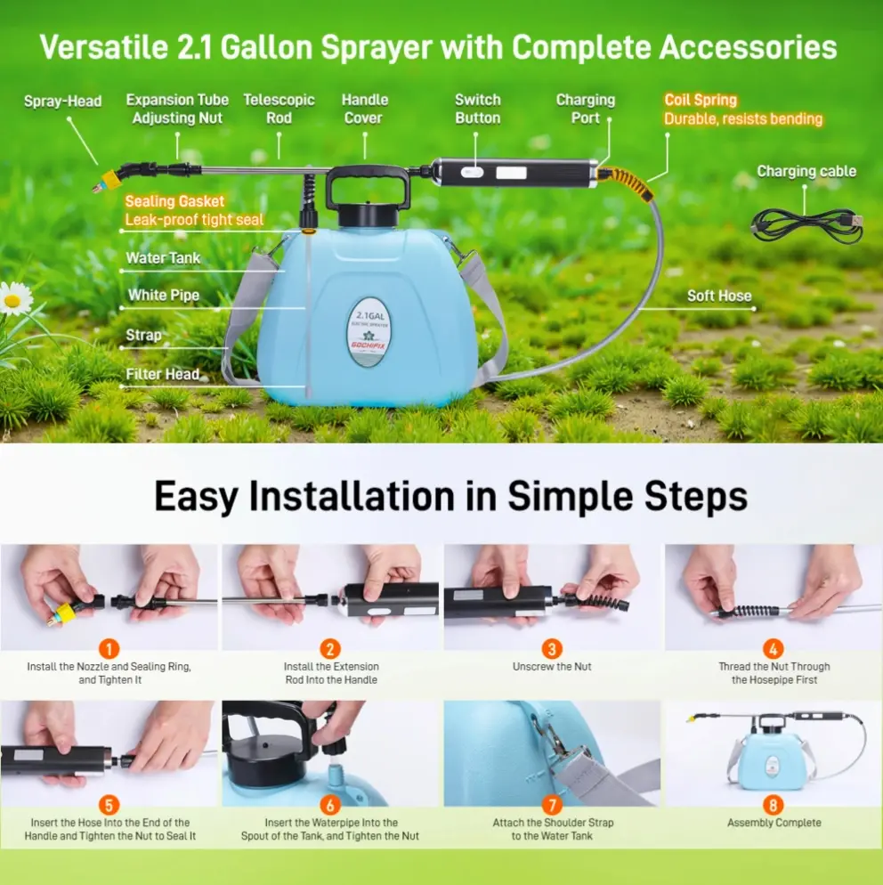 ·Assemble this battery powered sprayer in minutes. Its ergonomic design features a shoulder strap for portability even at full 2-gallon capacity. One-button operation with dual spray speeds simplifies tasks, while the telescopic wand reaches elevated areas effortlessly. The garden sprayer’s transparent window monitors liquid levels, ensuring uninterrupted use for lawns, greenhouses, or indoor cleaning.