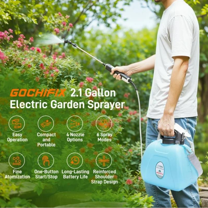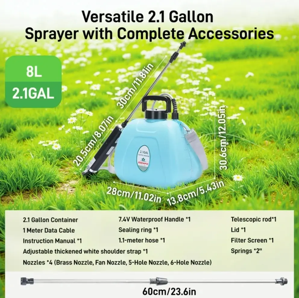 ·This electric sprayer revolutionizes gardening with 7.4V battery powered sprayer technology. The sprayer 2.11 gallon capacity (8L) paired with a 2000mAh battery sprayer runs 2 hours per charge, eliminating manual pumping. Perfect for sprayers in lawn and garden, its electric pump delivers strong spray for tall plants, covering large areas effortlessly. Ideal garden sprayer for daily tasks, saving labor and time with industrial-grade efficiency.【4 Adjustable Nozzles and 6 Spray Modes】