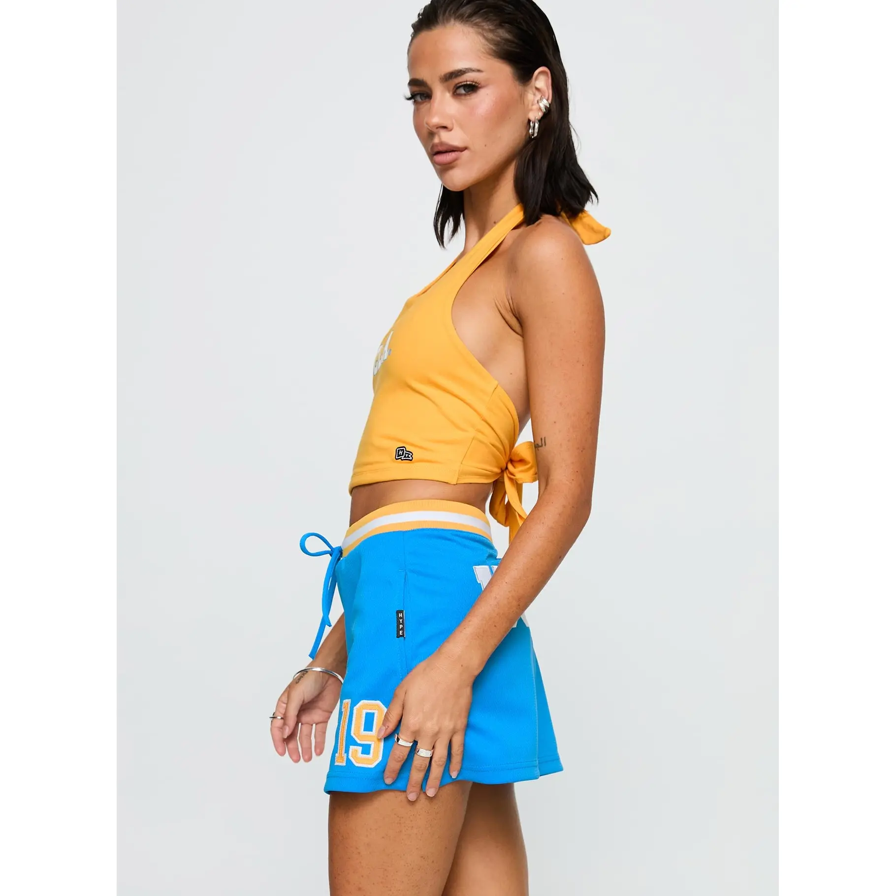 ·Mesh fabric, two-color waist detail, elasticated, tie front, twin-hip pockets, 19 number detail, UCLA feature at back, split sides, hype & vice logo detail, mid-rise fit