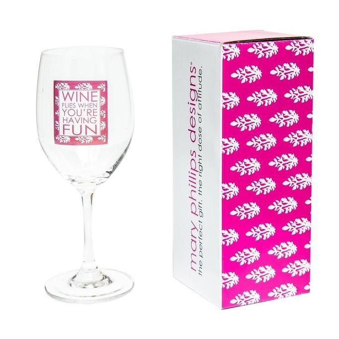 Perfect for birthdays, hostesses, or girlfriend gifts, the "Wine Flies When You're Having Fun" wine glass features a bohemian pattern in fun fuchsia and white. Enjoy a generous 16 oz pour with this delightful glass that comes in a matching gift box, making it easy to give (or keep for yourself!). From Mary Phillips.