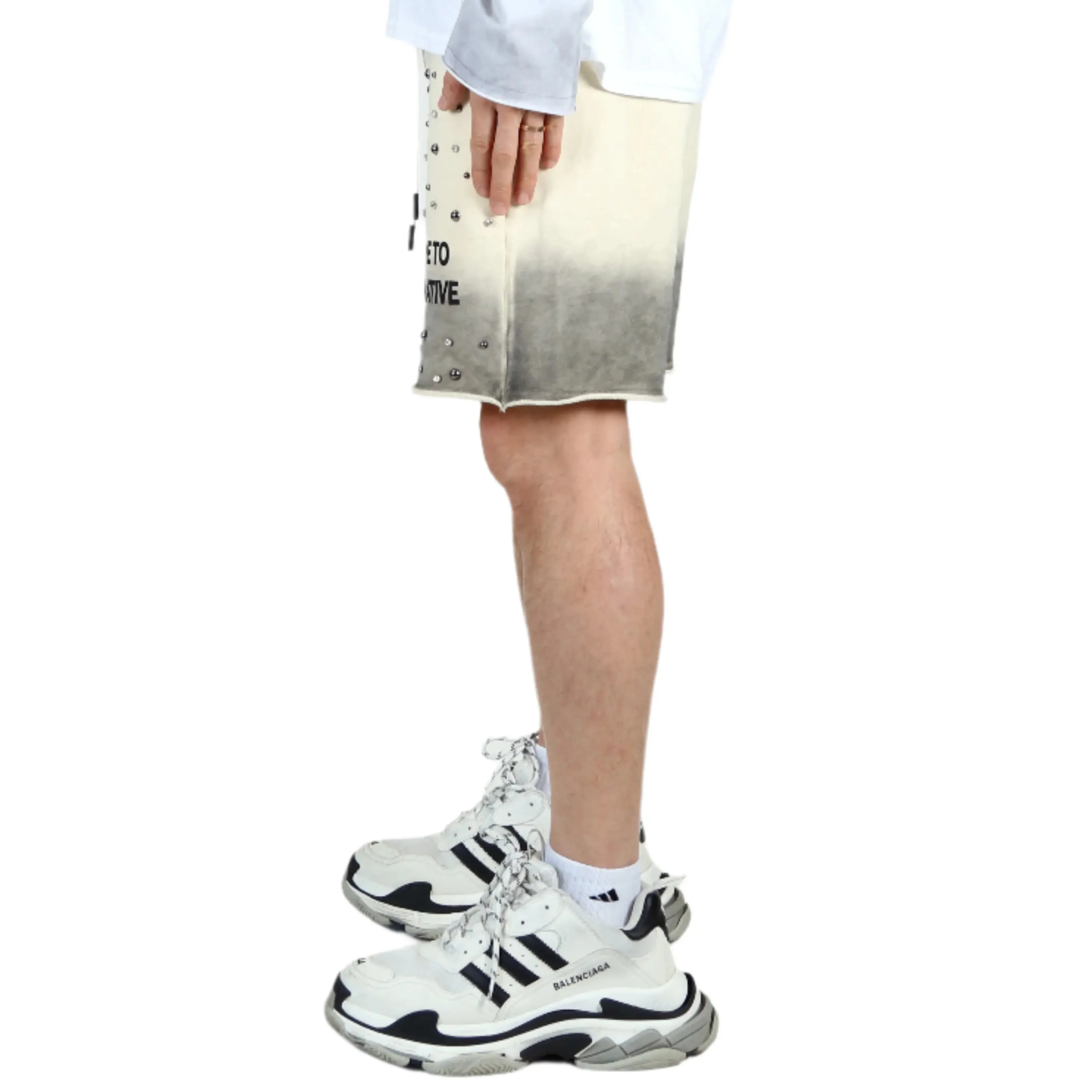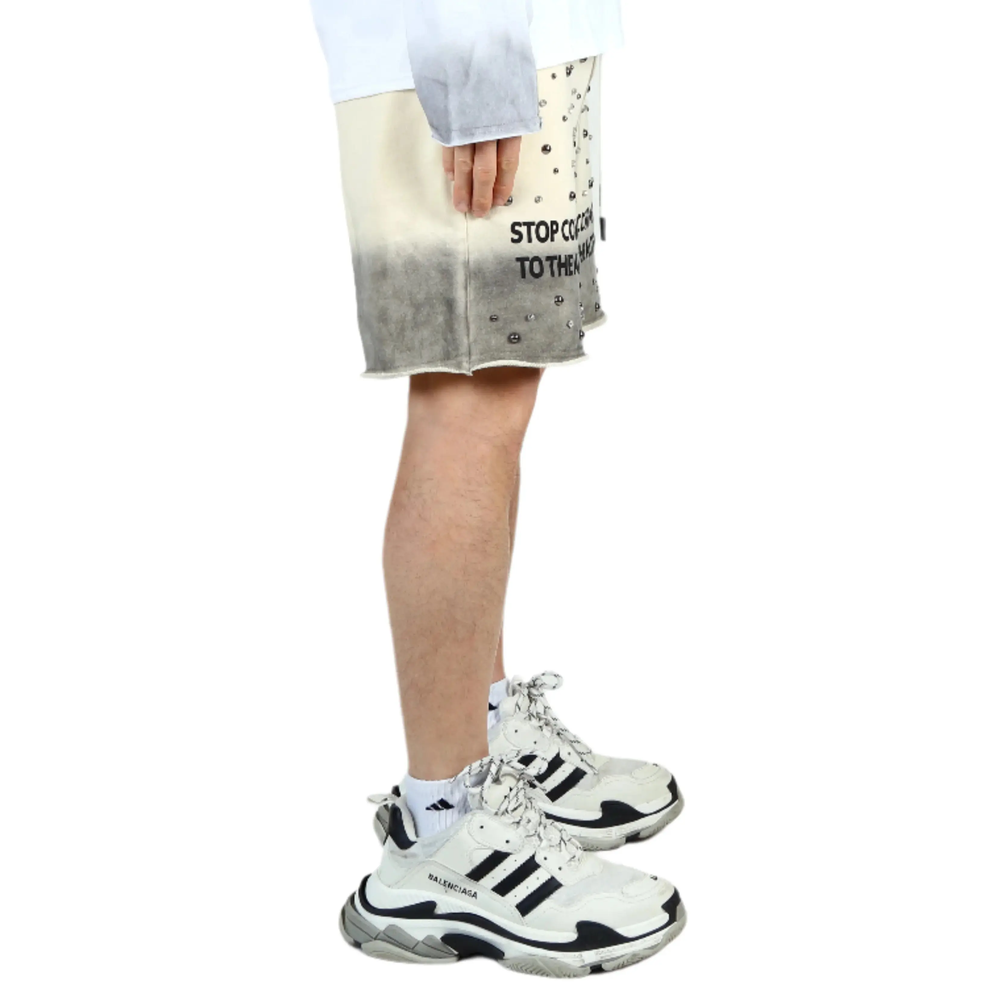 ·Washed French Terry Short PantsAbove Knee lengthMixed Crystal Clear & Silver Studs on sleeve.Designed by L.T.KImported.