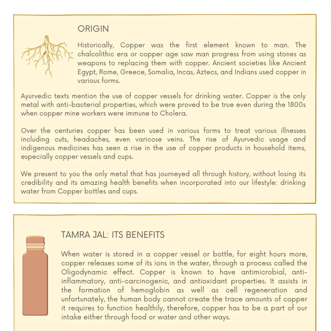 ·Purification process: Copper is proven to be naturally antimicrobial and can potentially kill all the microorganisms (present in the water) when stored in a Copper vessel -- such as molds, fungi, algae, and bacteria, that could be harmful to the body.
