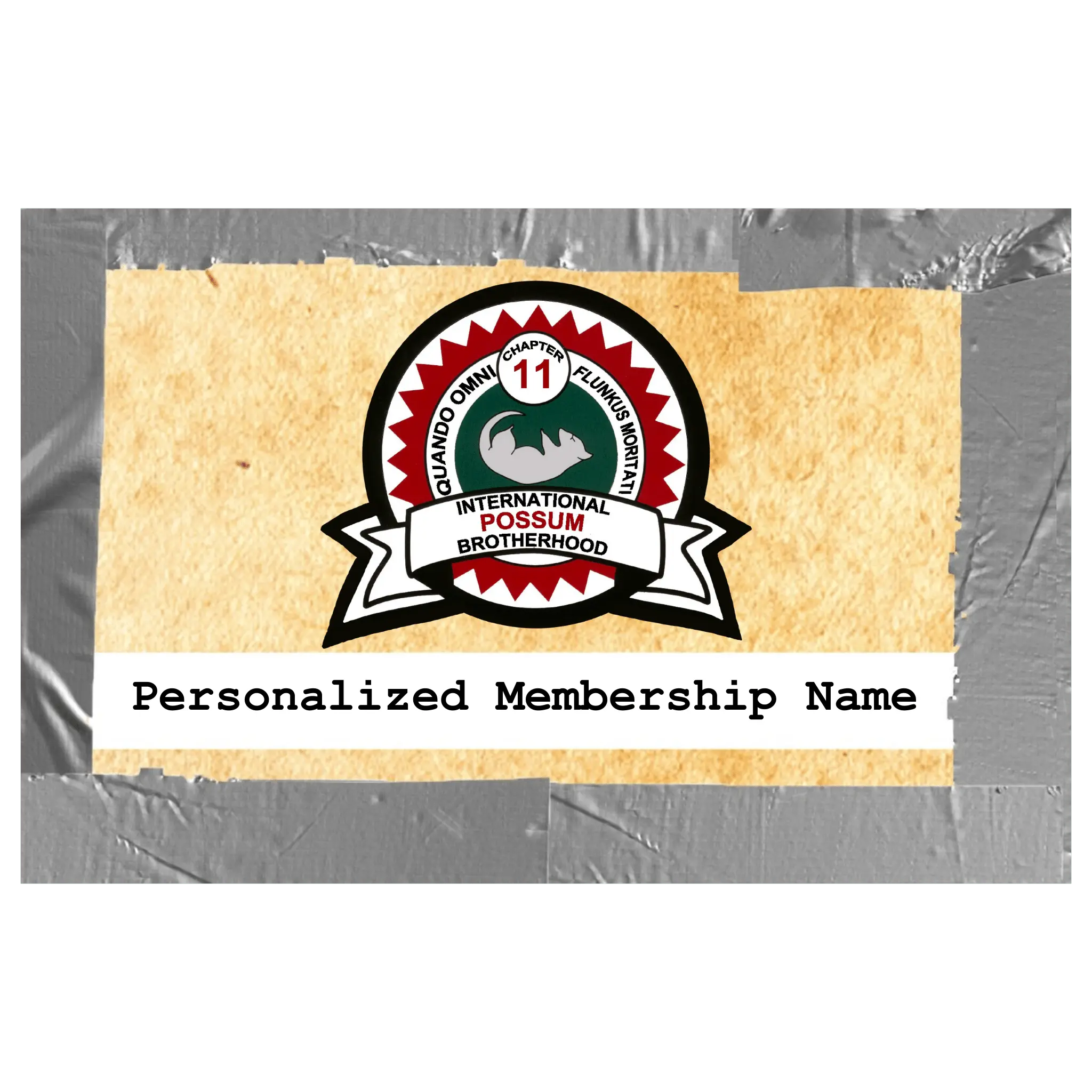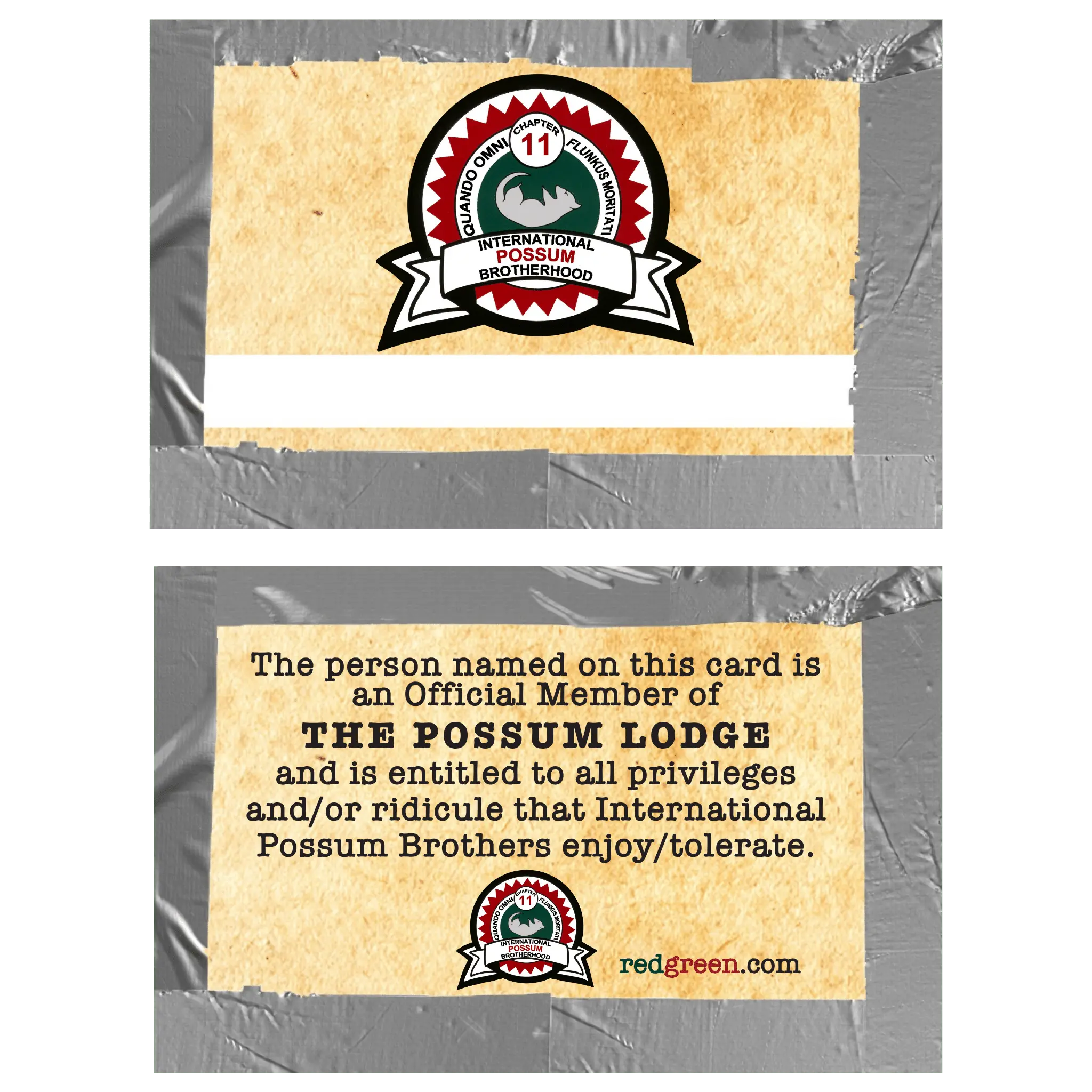 Back: Explanation of Membership with the Possum Lodge Logo and website URL: "The person named on this card is an Official Member of The Possum Lodge" and is entitled to all privileges and/or ridicule that International Possum Brothers can tolerate." The edges of the card display a duct tape edge.