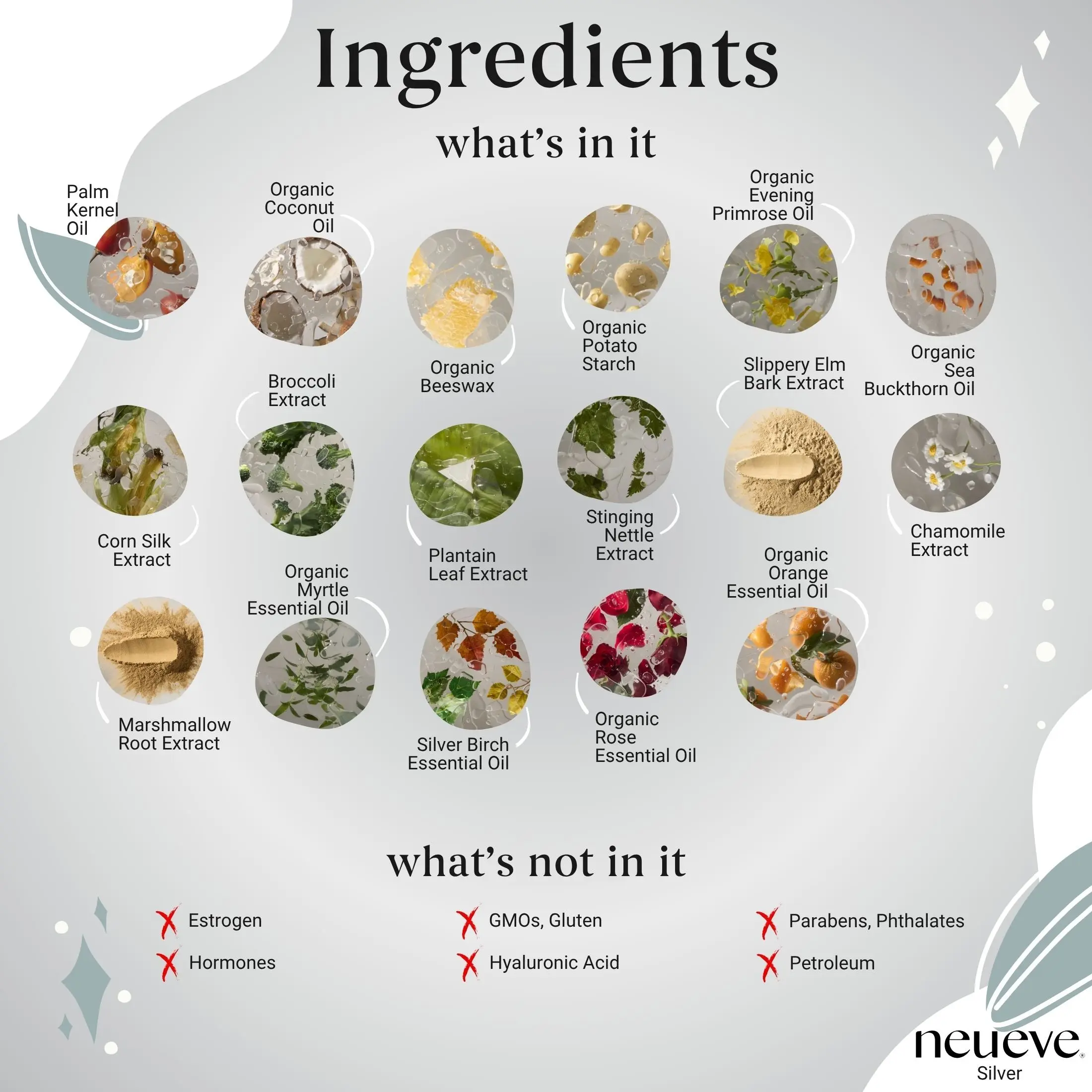 NeuEve is free from hormones, estrogen, gluten, soy, herbs like black cohosh or wild yam, preservatives, and GMOs. It also contains no boric acid, petrochemicals, parabens, BHT, T.E.A, M.E.A, urea, glycols, or PEGs. Additionally, NeuEve is cruelty-free and never tested on animals.