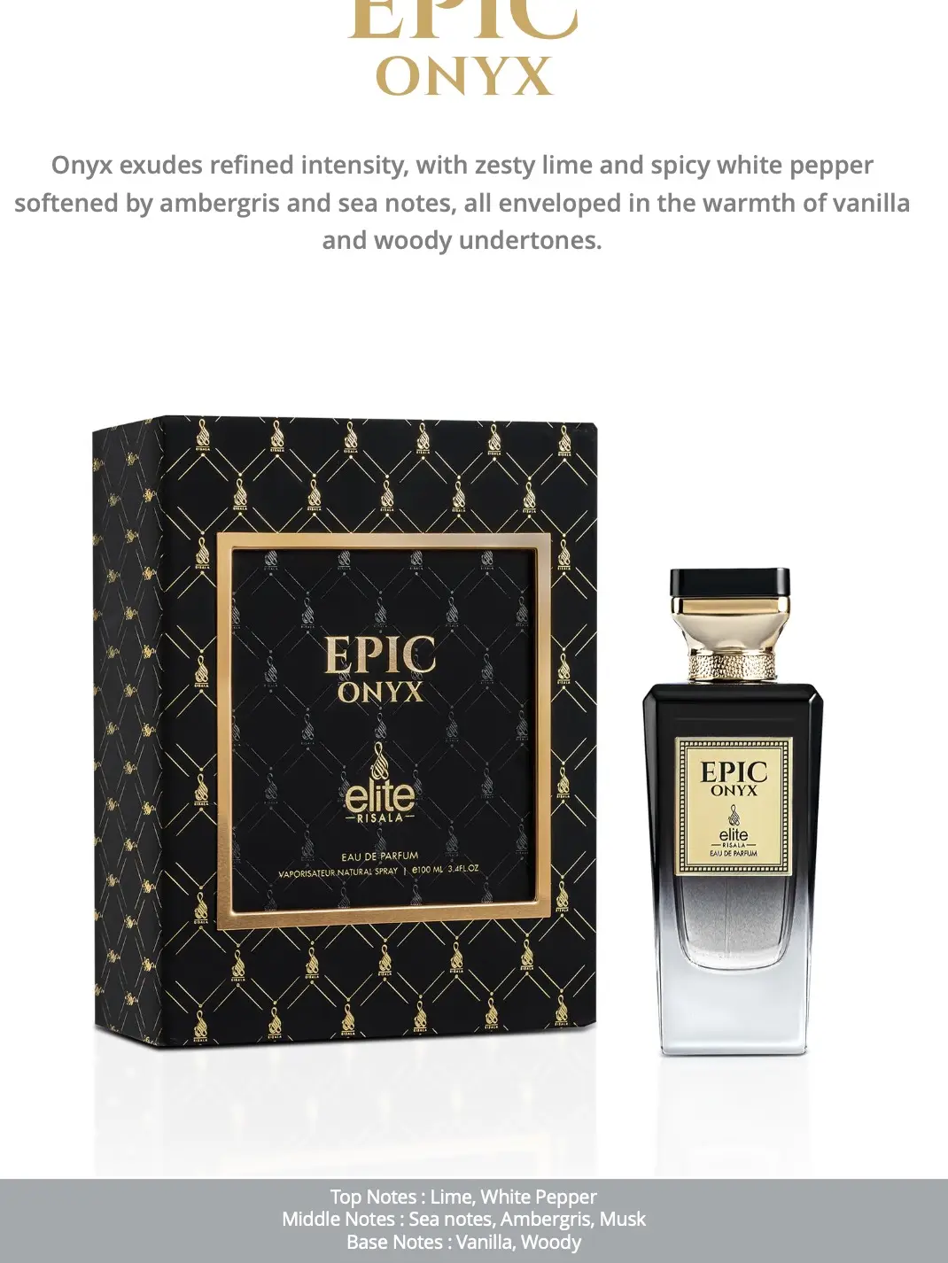 Risala Elite Epic Onyx is a unisex Eau de Parfum introduced in 2024, offering a sophisticated blend of citrus, marine, and woody notes.