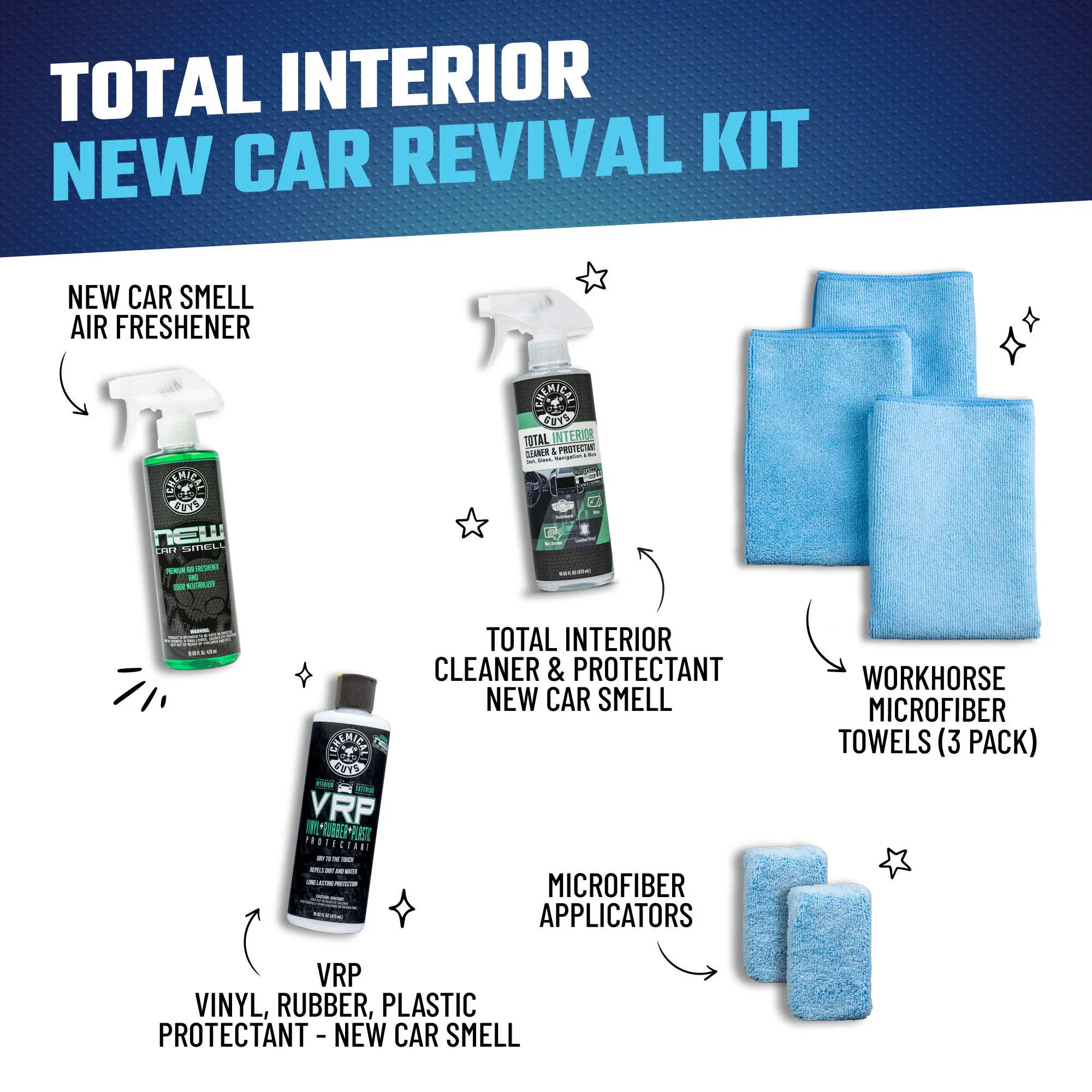 ·Bundle 3 Includes (Total Interior New Car Revival): Total Interior (16oz - New Car Scent) + VRP (16oz - New Car Scent) + Air Freshener (16oz - New Car Scent) + 3-pack Workhorse Microfiber Towels + 2-pack Microfiber Applicators