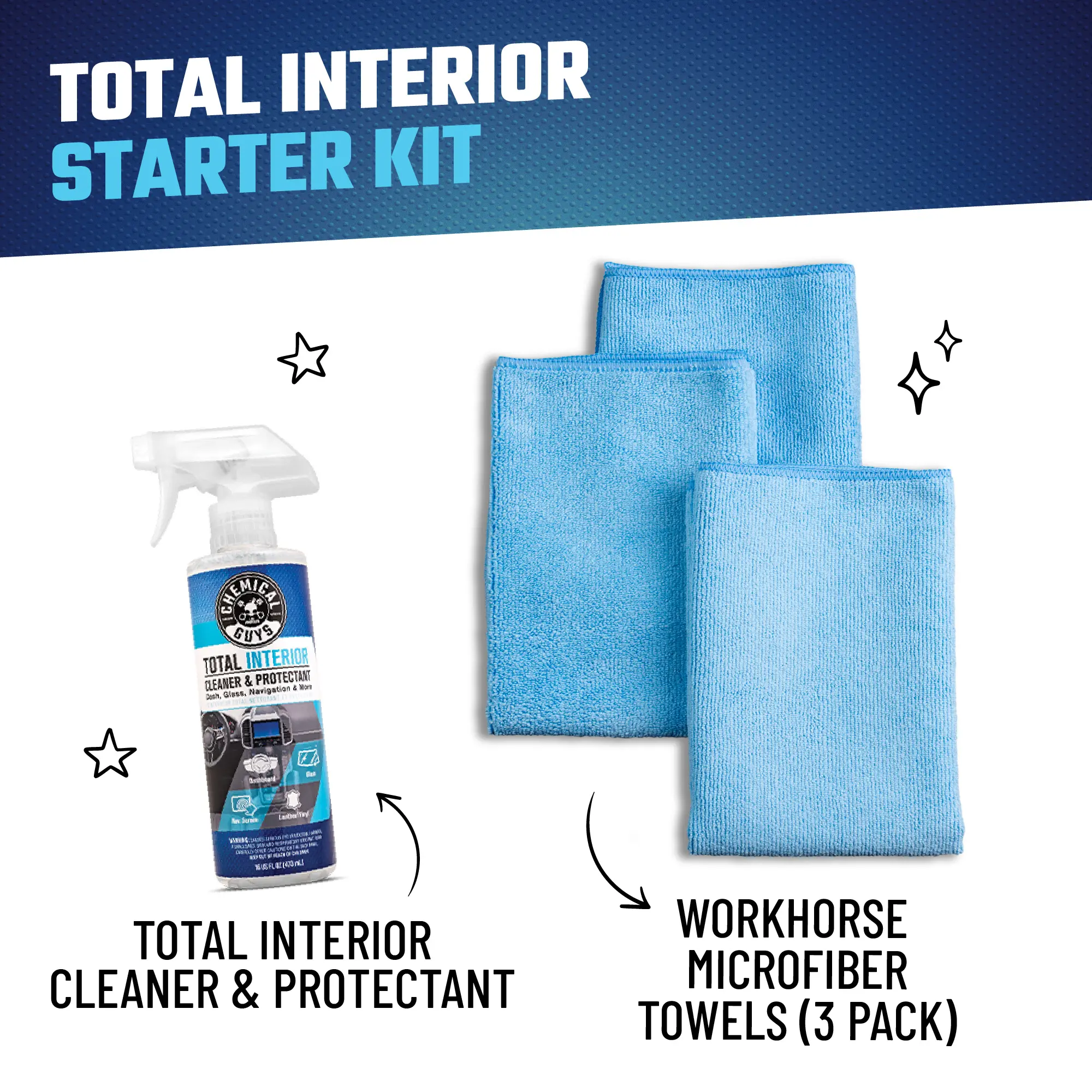·Bundle 1 includes (Total Interior Starter Kit): Total Interior (16oz) + 3-pack Workhorse Microfiber Towels