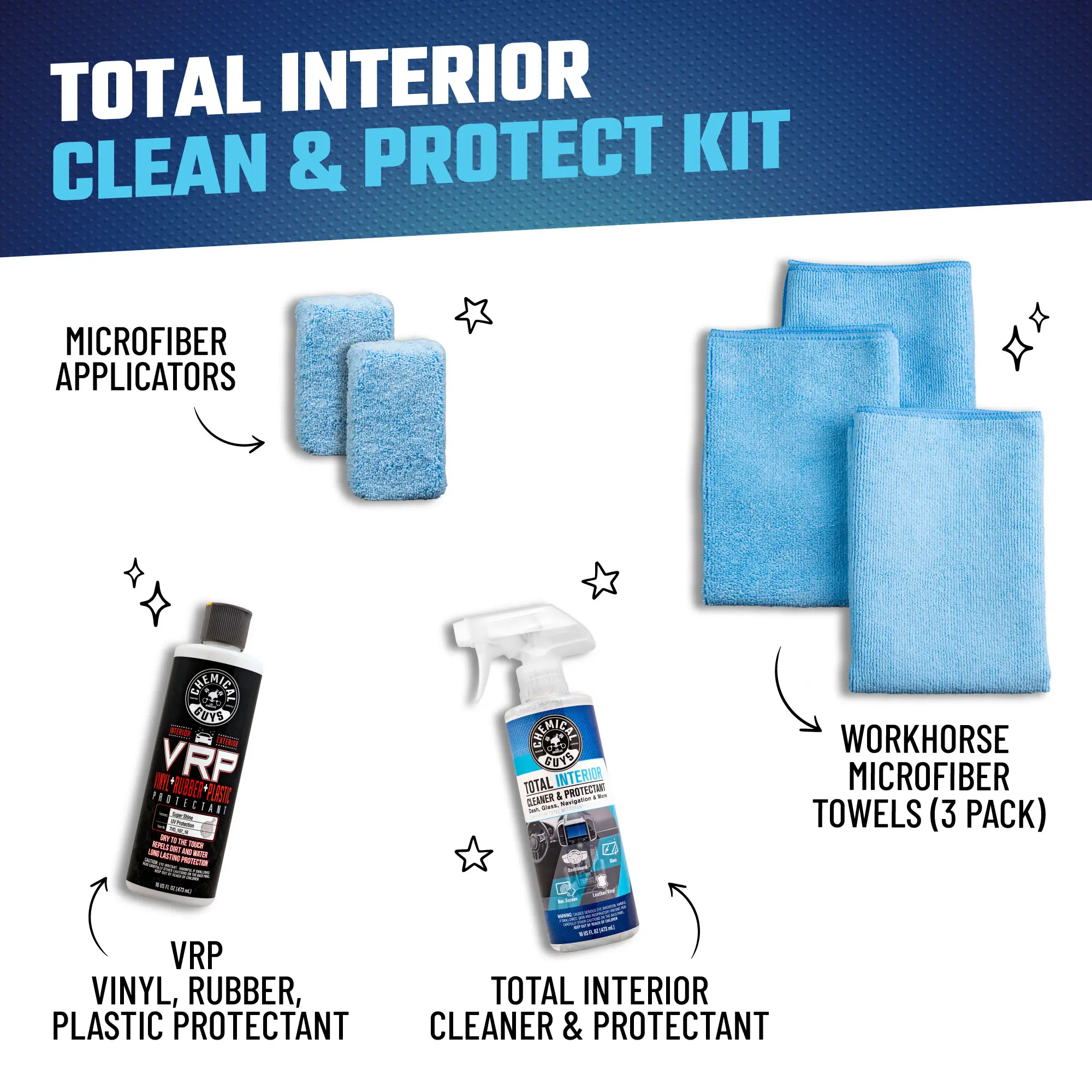 ·Bundle 2 includes (Total Interior Clean & Protect Kit): Total Interior (16oz) + VRP (16oz) + 3-pack Workhorse Microfiber Towels + 2-pack Microfiber Applicators