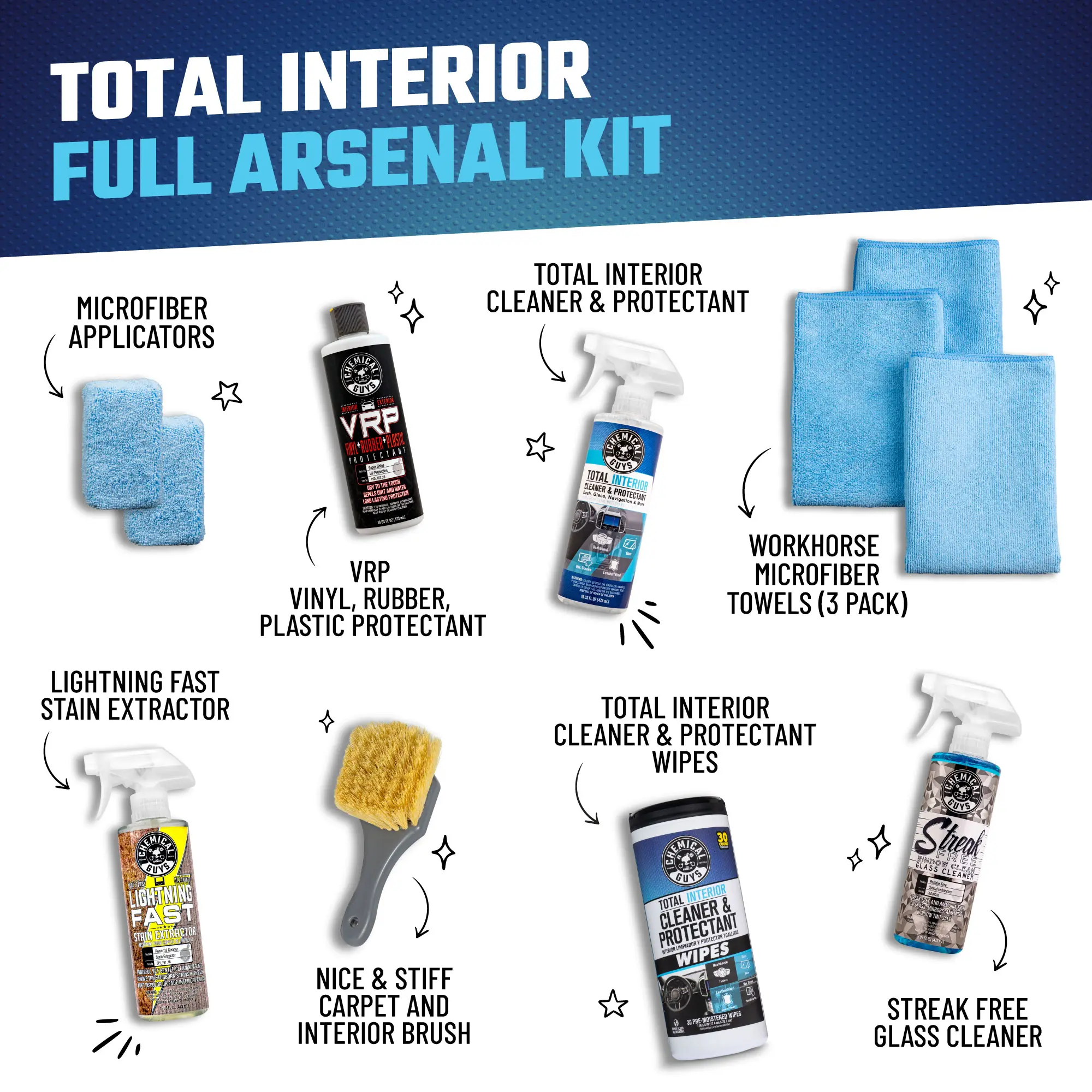 ·Bundle 4 includes (Total Interior Full Arsenal): Total Interior (16oz) + Total Interior Wipes + VRP + Streak Free + Lightning Fast + 3-pack Workhorse Microfiber Towels + 2-pack Microfiber Applicators + Nice + Stiff Brush