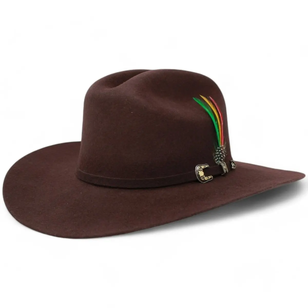 Este elegante sombrero de la marca Tombstone Hats está confeccionado a mano en 100% lana de borrego, garantizando calidad y durabilidad. Su acabado en color café chocolate y su calidad 20X con plumas lo convierten en una pieza única y auténtica.