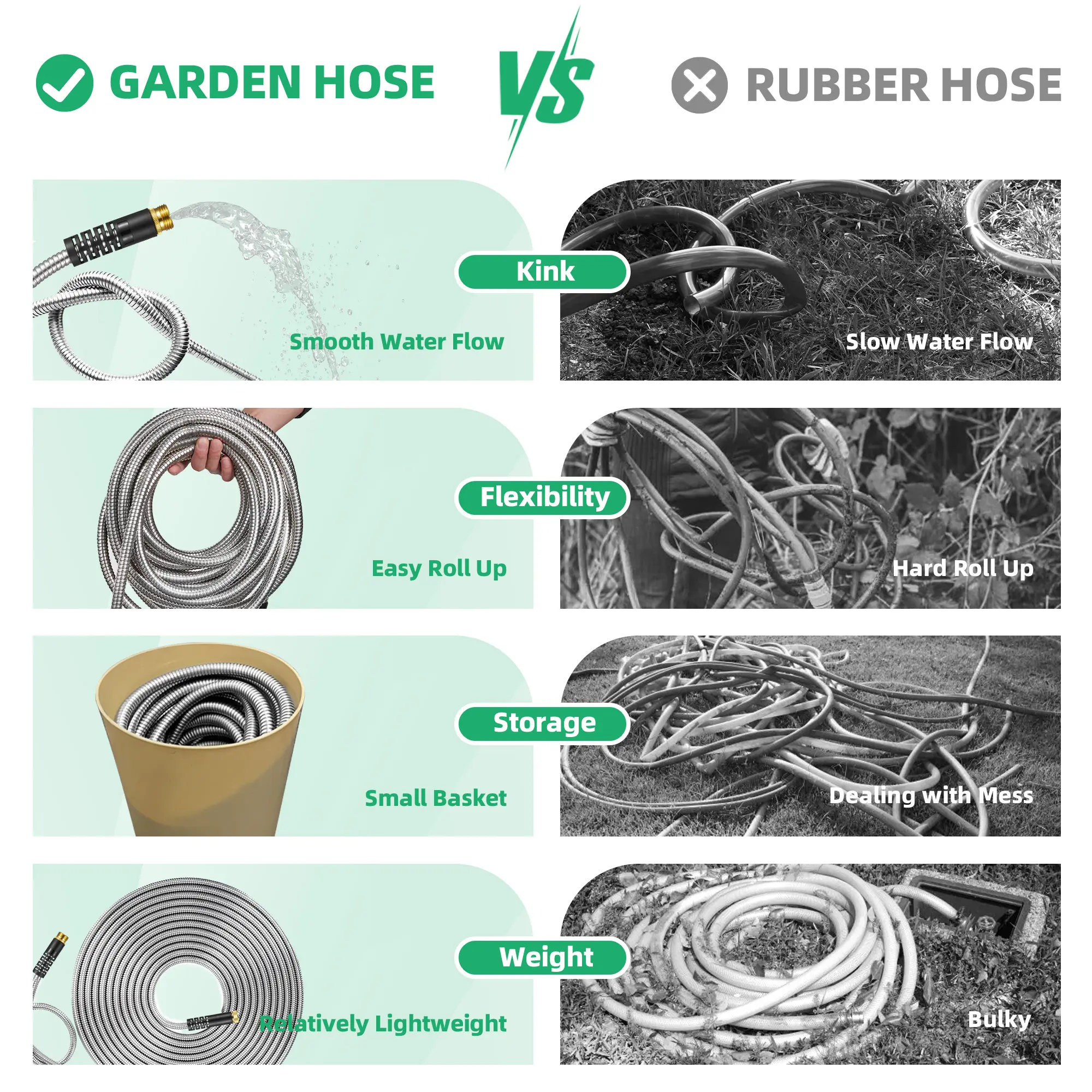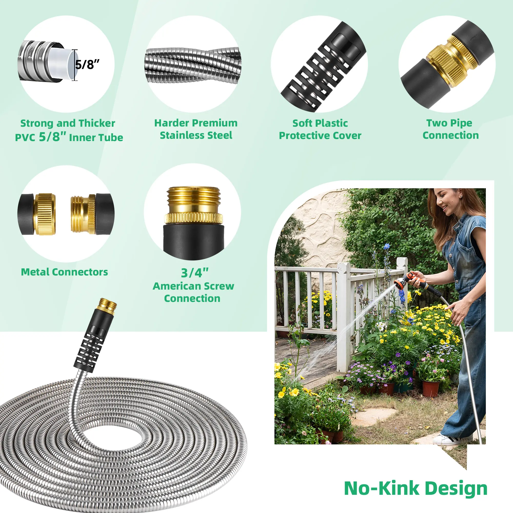 ·Strongest Metal Hose: This metal garden hose can withstand water pressure up to 150PSI due to the stainless steel outer pipe and thickened PVC inner pipe. No more rusting, bursting, or leaking.