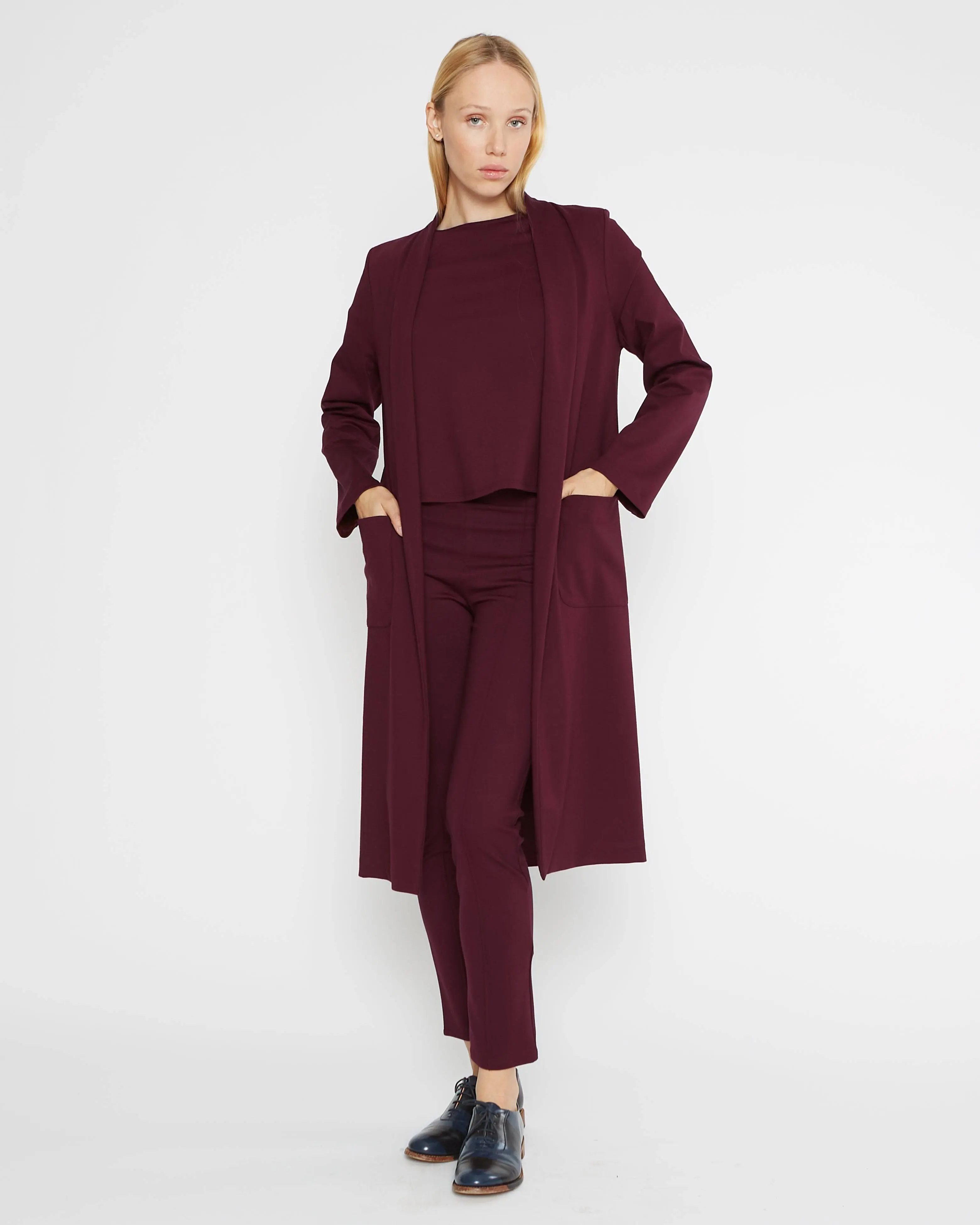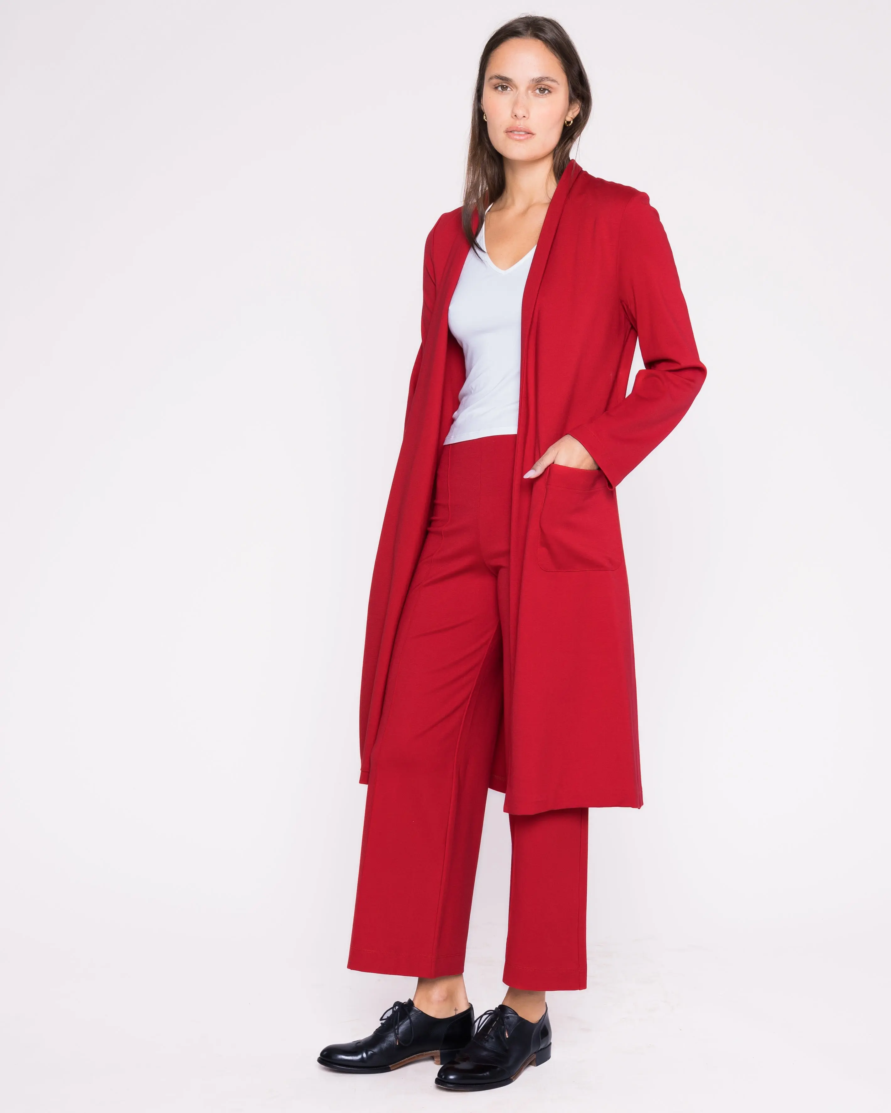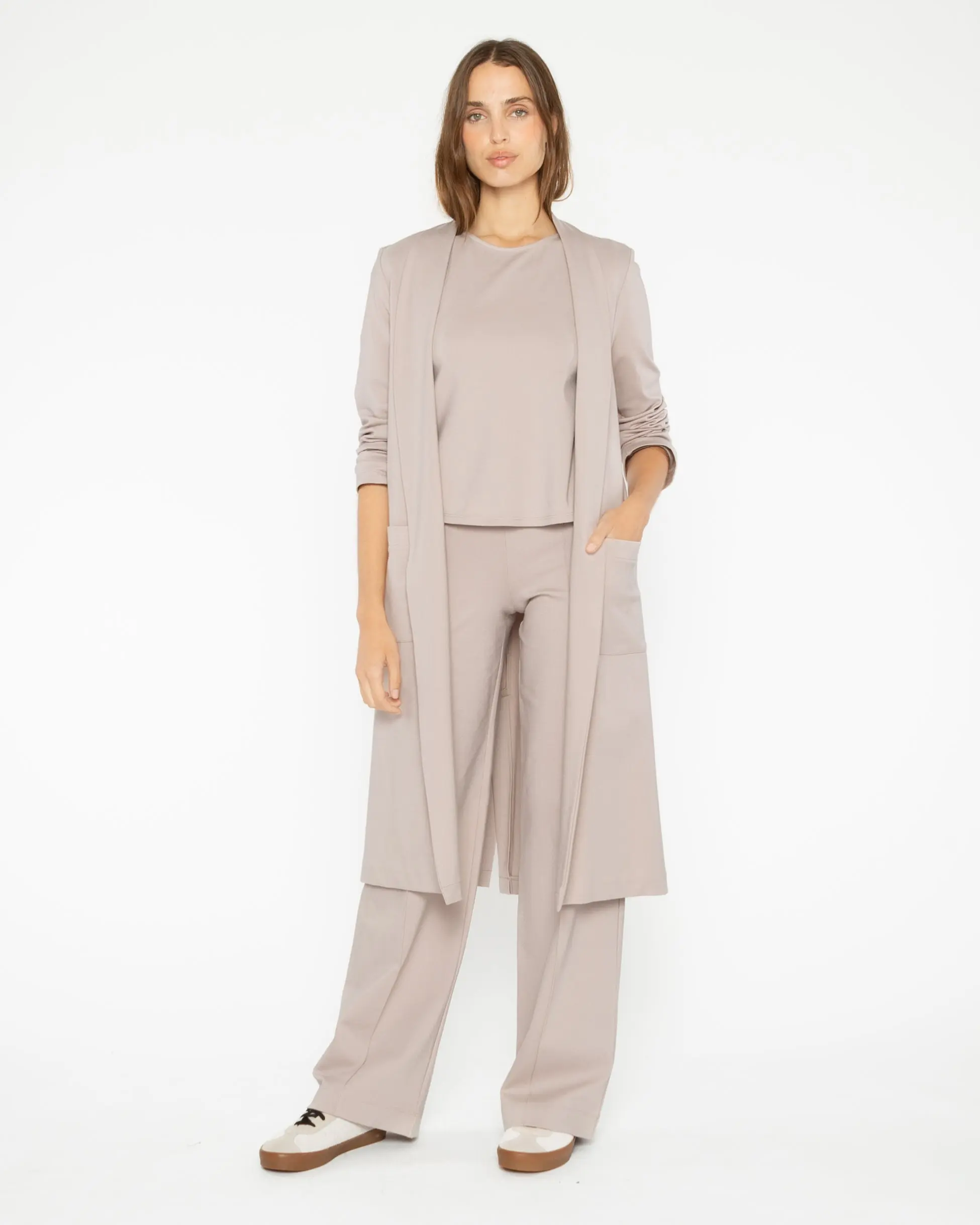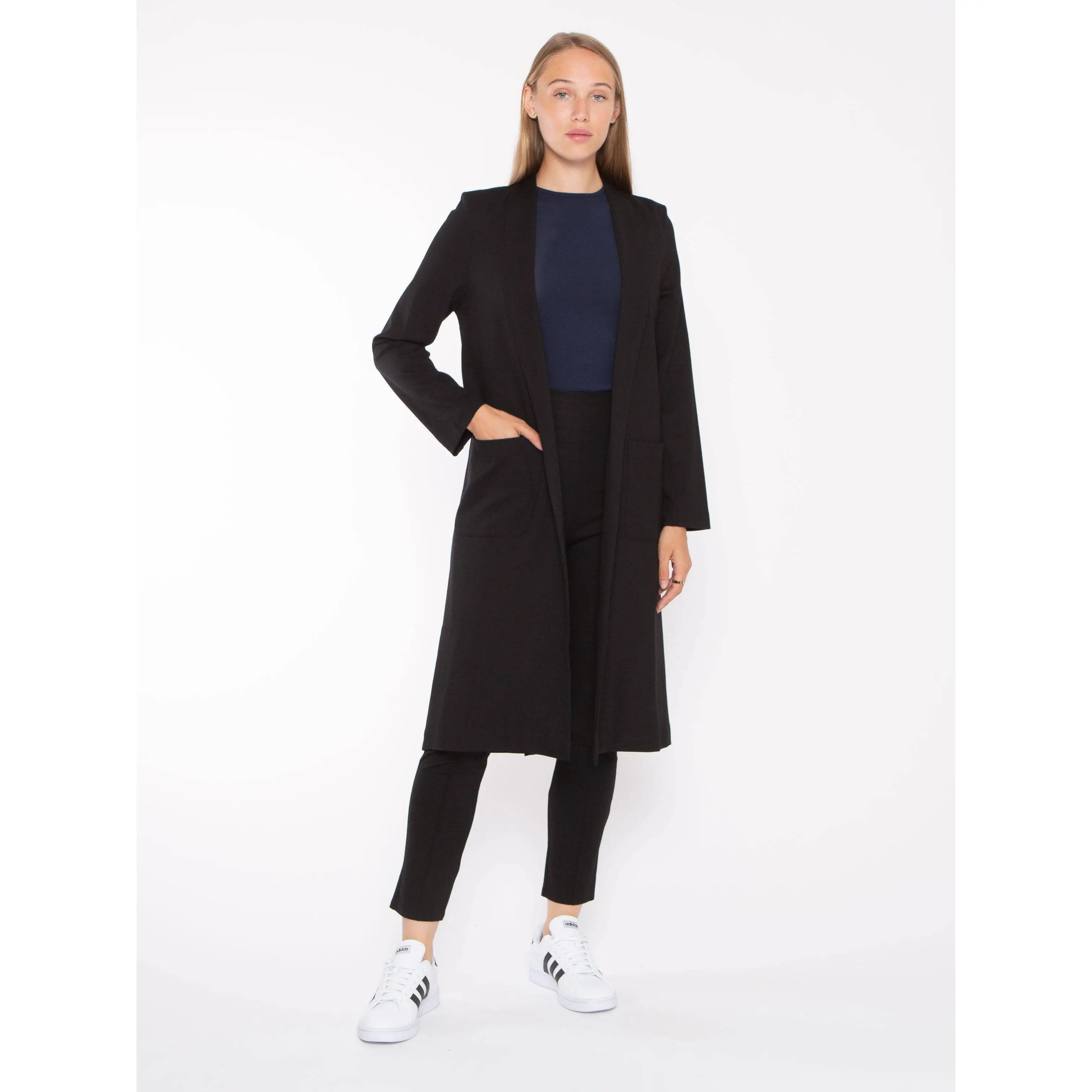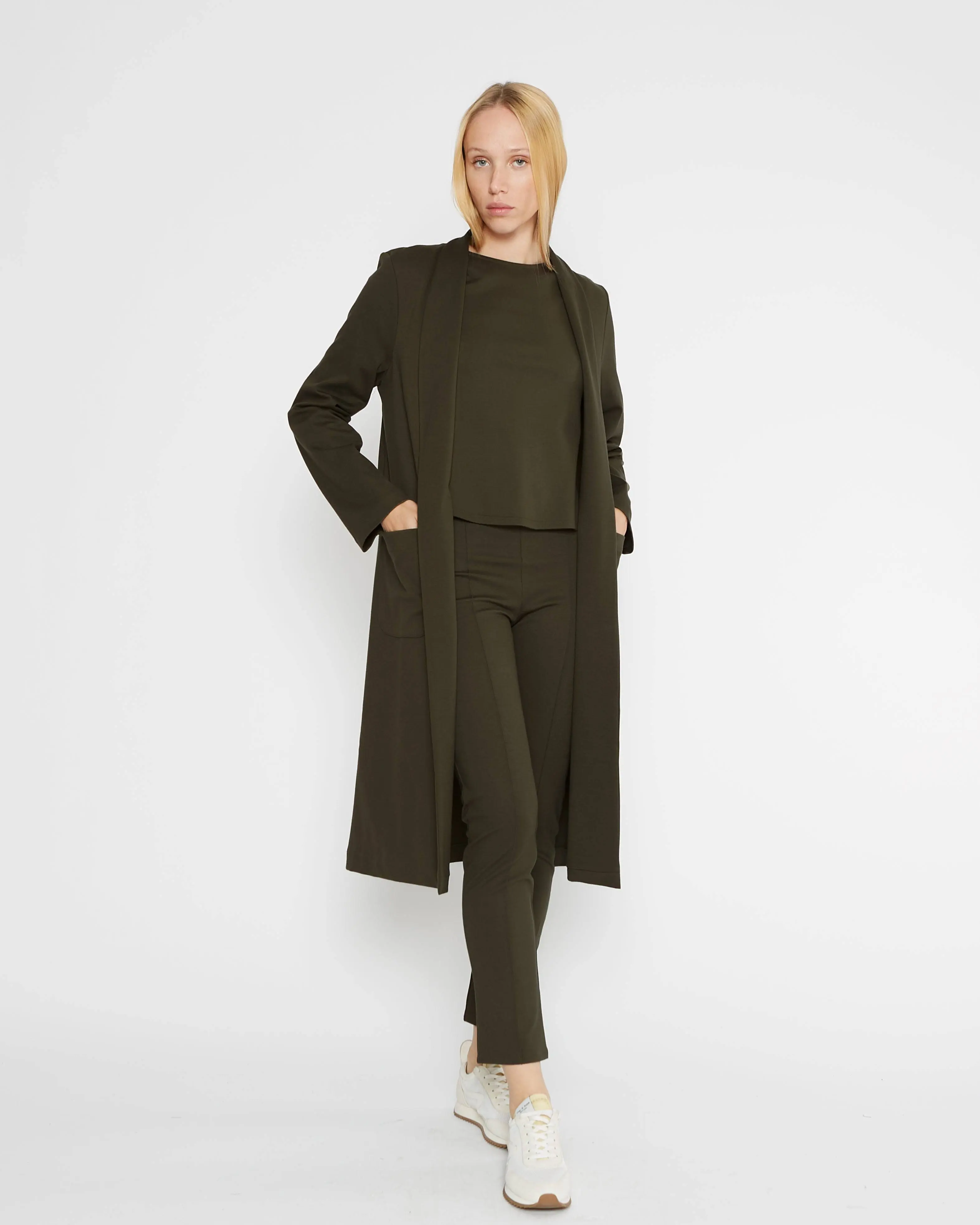 Soft ponte knit fabric creates the structured look but doesn't wrinkle. A modern take on a classic. Turn in your duster for this chic piece. Self-lined lapels and deep pockets. The perfect piece to pair with our wide or straight leg pant.