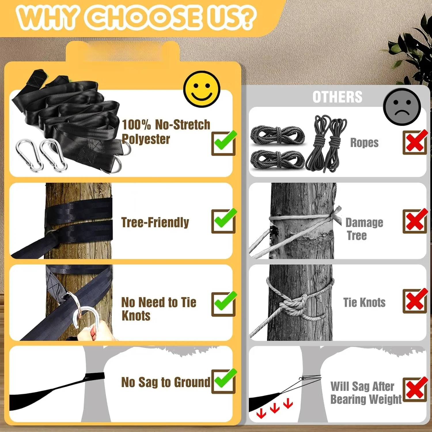 Suspension System: It comes with tree-friendly high-density nylon straps and 2 carabiners, which makes it easy to set up and take down the hammock without damaging the trees. This type of suspension system will bring you more comfortable and relaxing experience.The hammock structure is sturdy enough to support the weight of the hammock and its occupants
