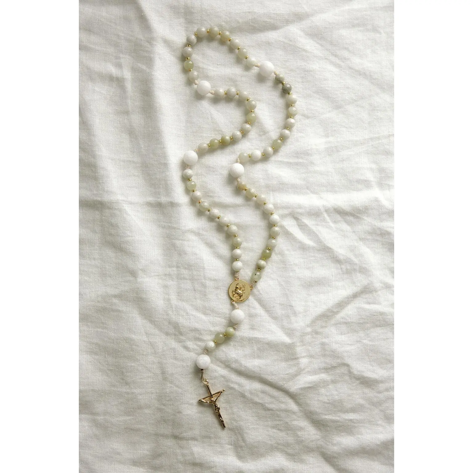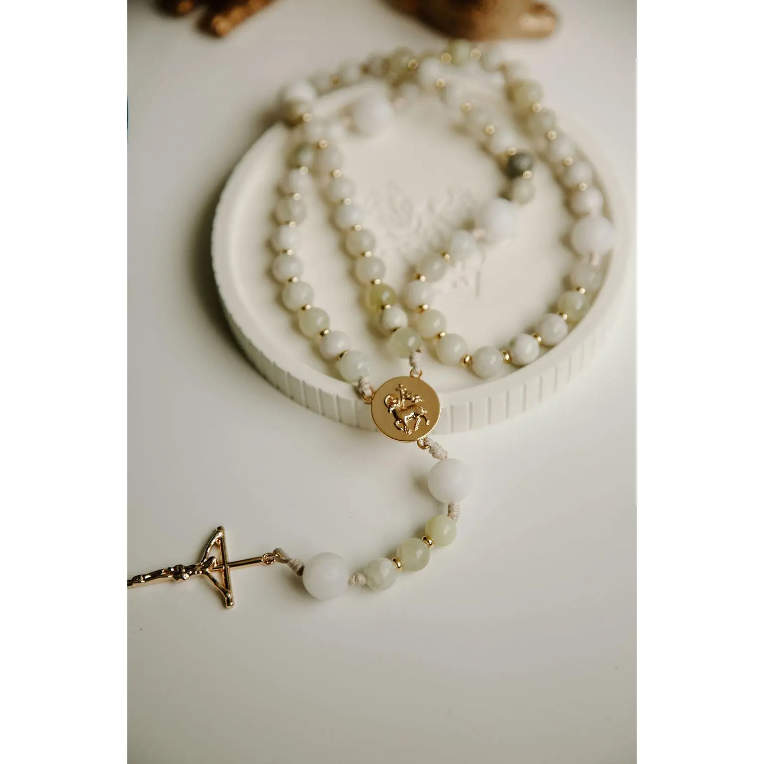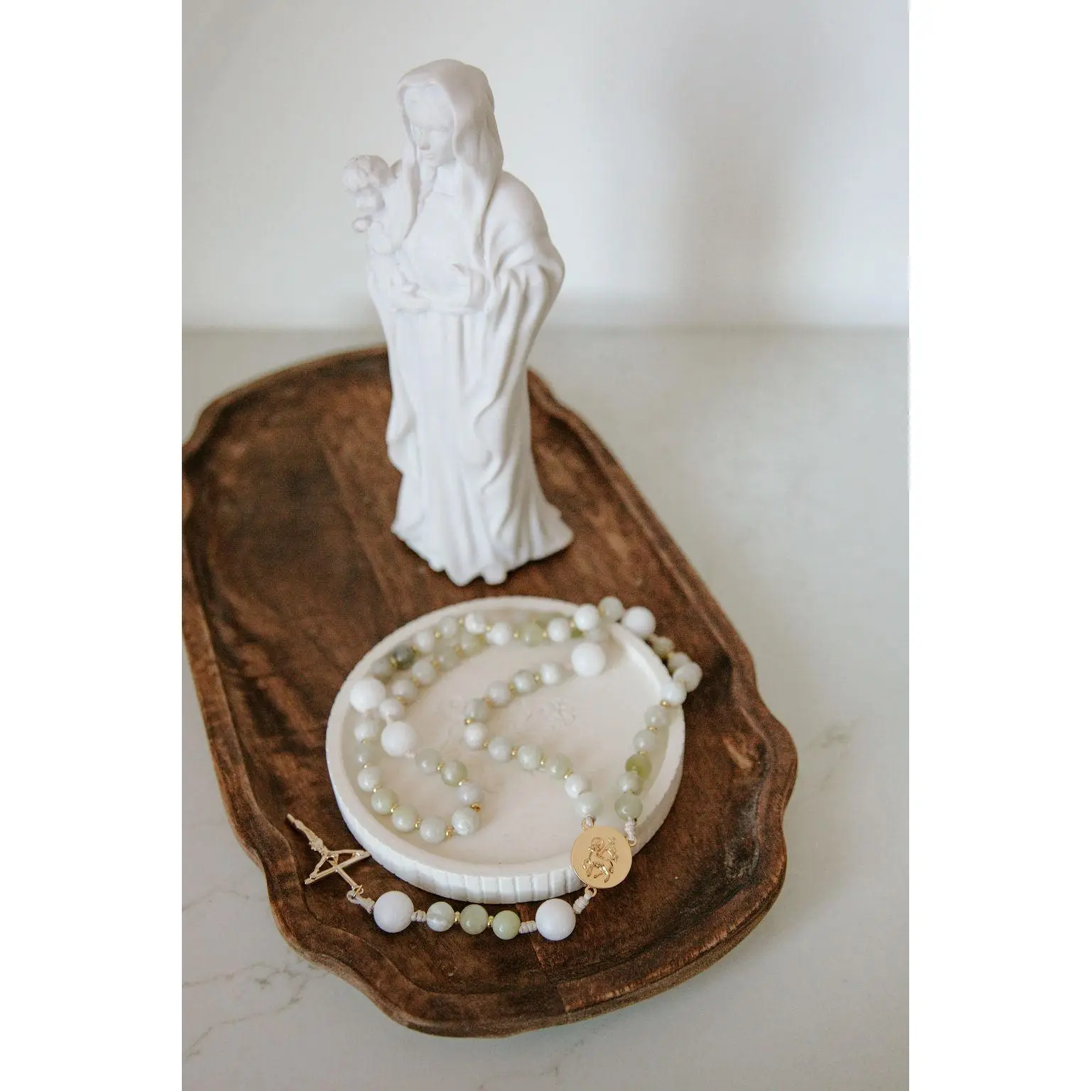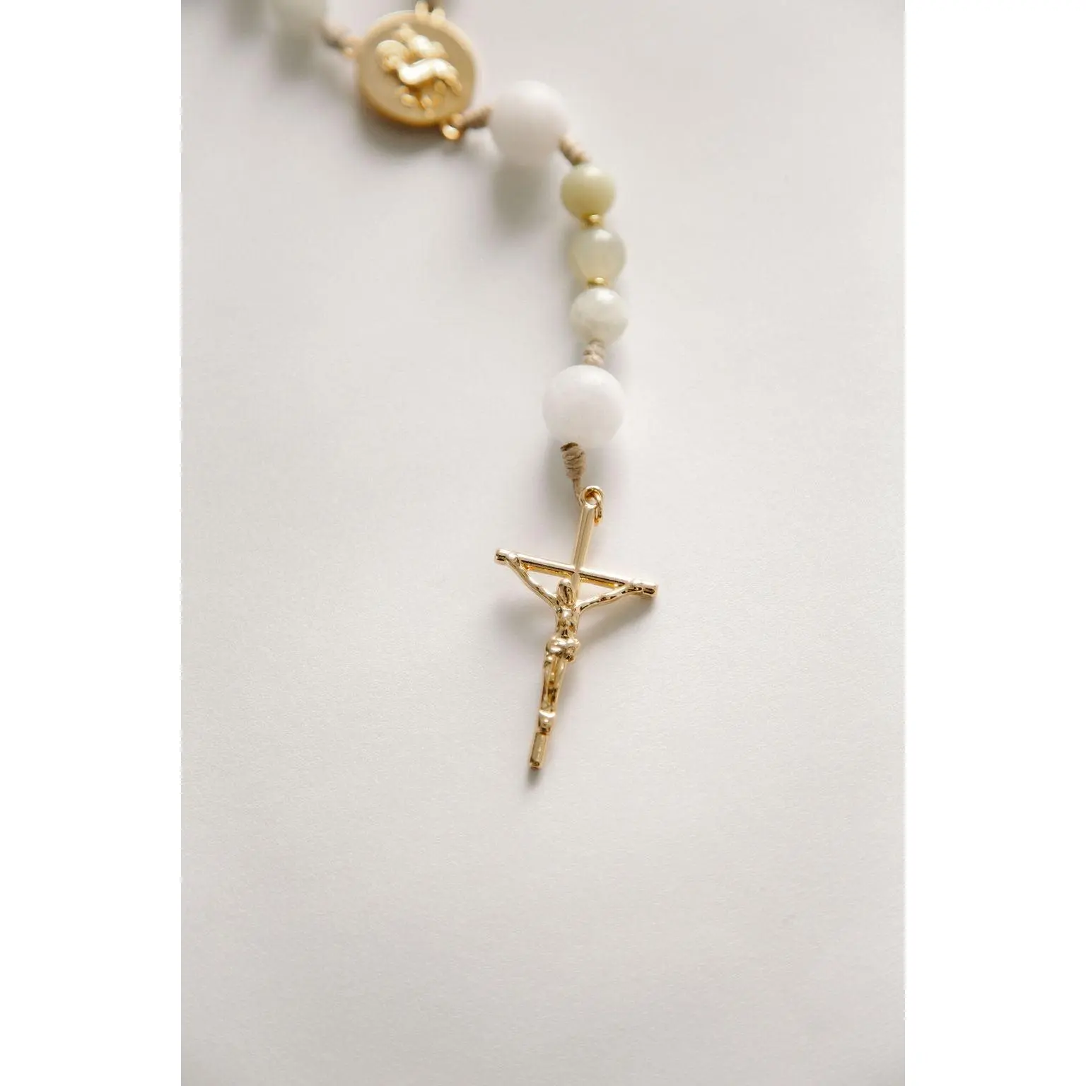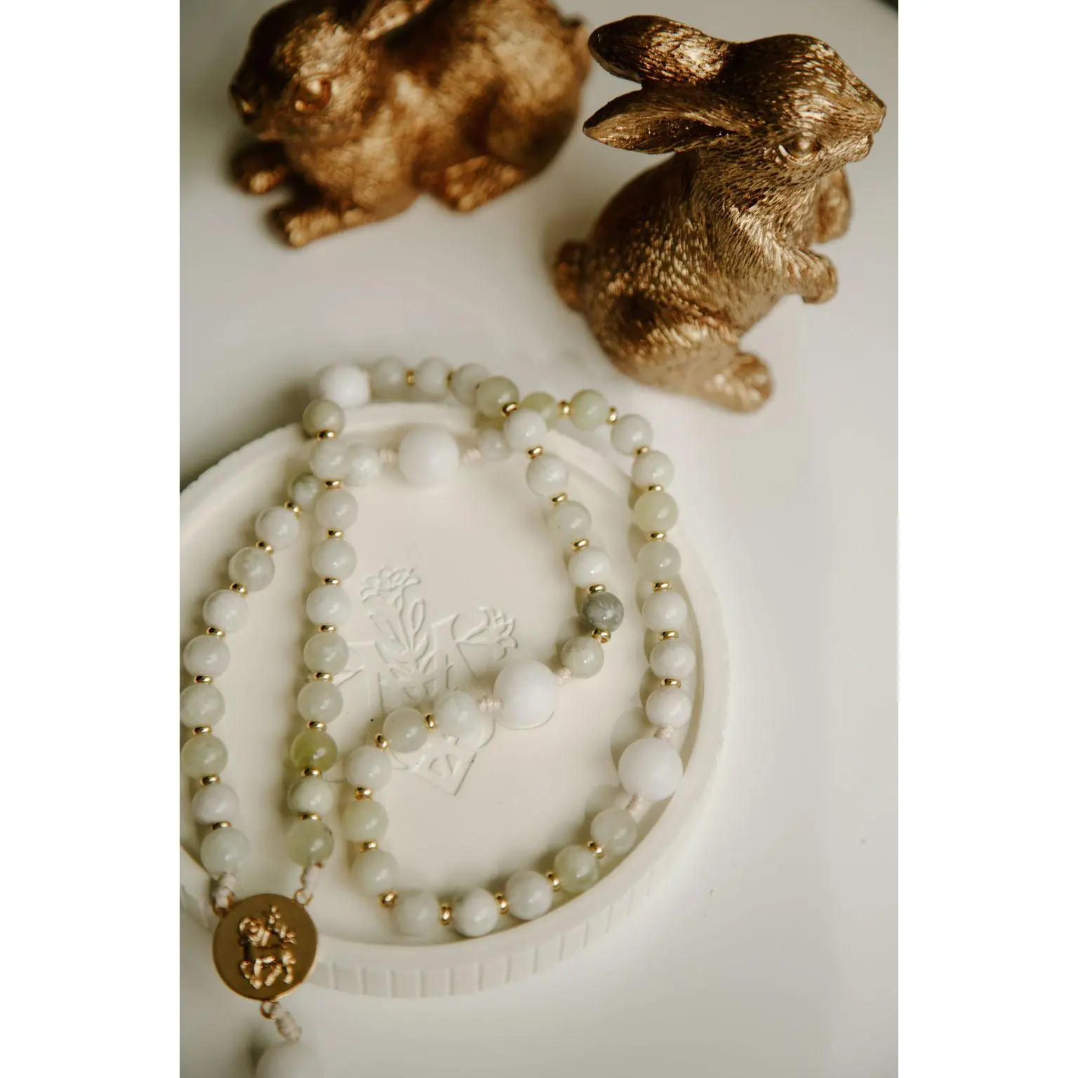 The Paschal Lamb Rosary is a limited-edition piece inspired by the beauty and hope of Easter. Soft green Hail Mary beads reflect the newness of life in spring and the promise of the Resurrection, while the white Our Father beads symbolize Christ’s victory over death.