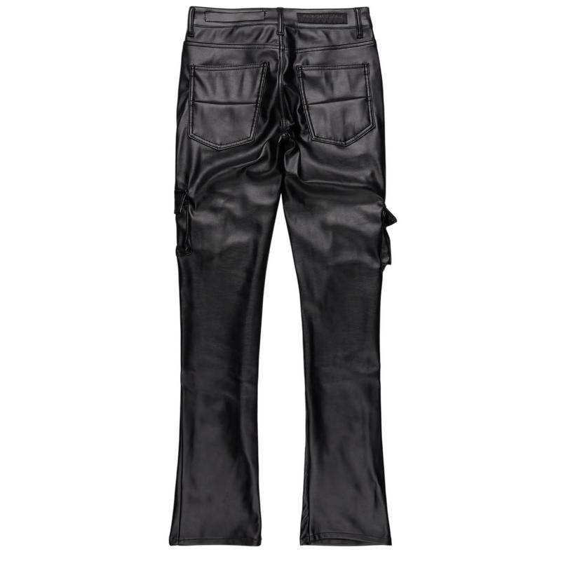 An urban stacked flare cargo jean for men in black. Designed with faux leather fabric and utility pockets for a must-cop streetwear style.