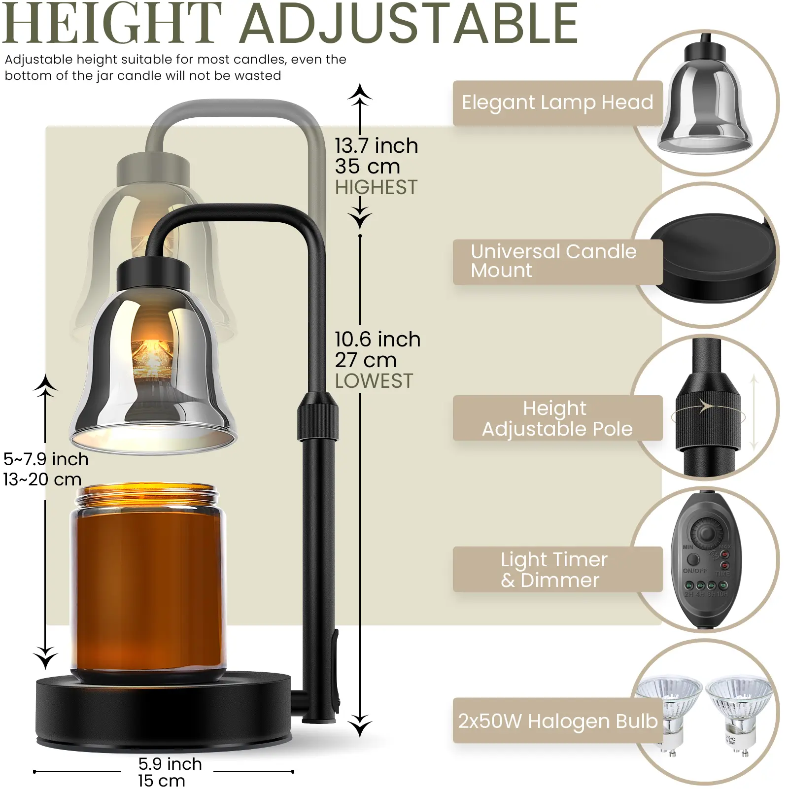 ·CONVENIENT AND ADJUSTABLE: Enjoy the convenience of adjustable height with our Candle Warmer Lamp. Easily customize the height according to your preference and the size of the jar candle. Its electric warmer gently melts the candle from top to bottom, utilizing a 50W GU10 halogen bulb for efficient and quick fragrance diffusion