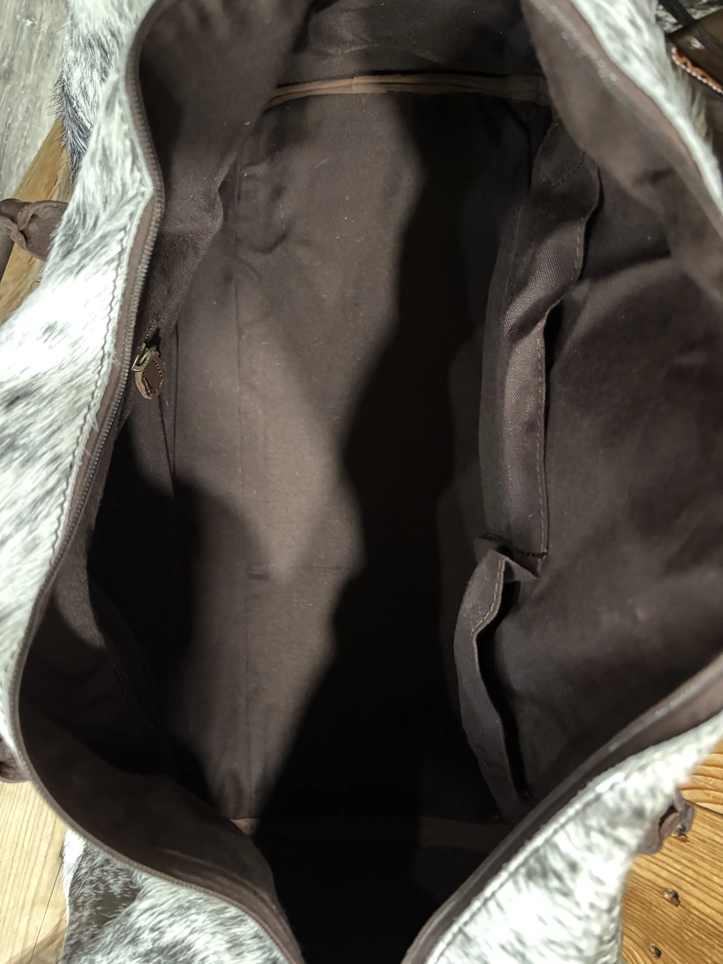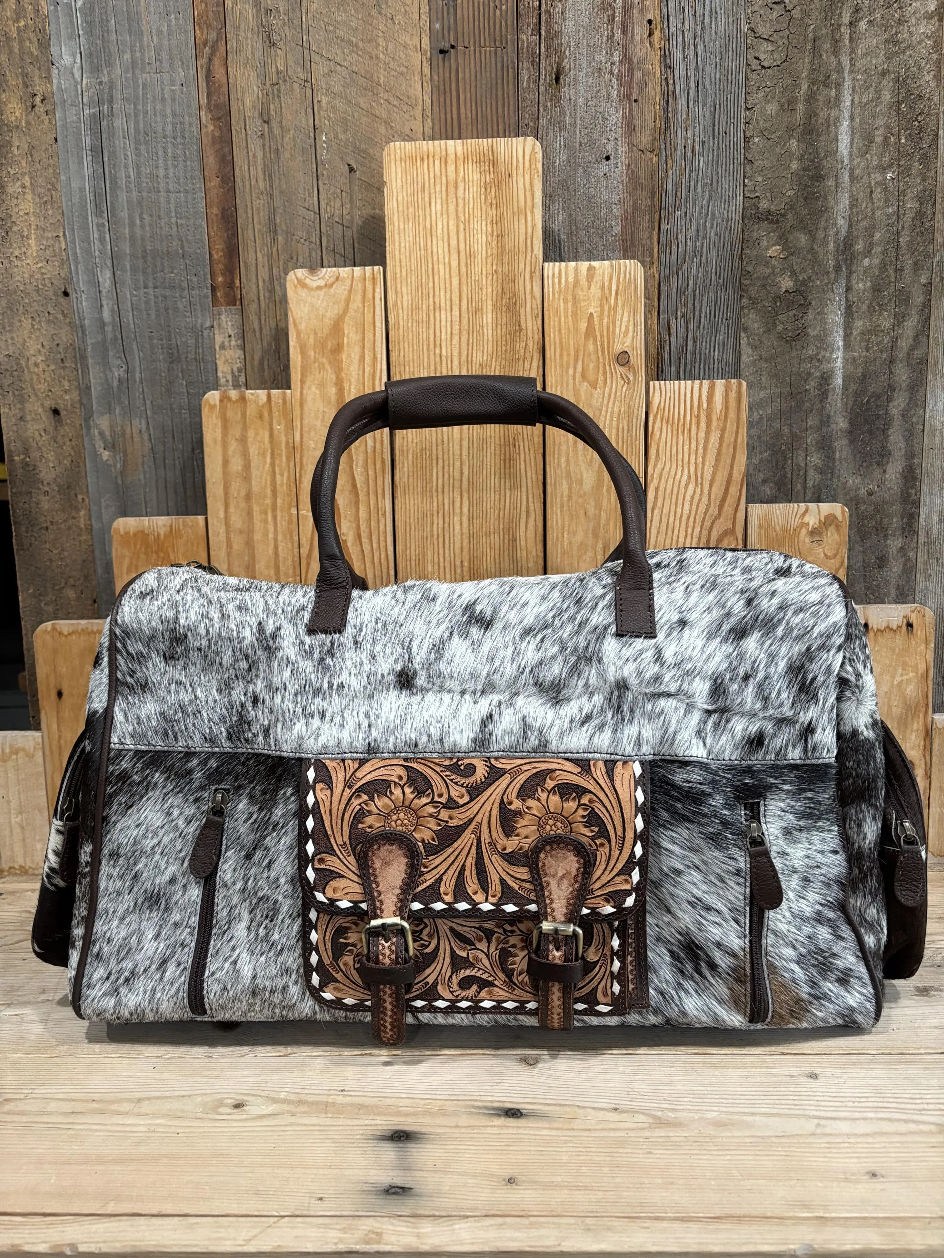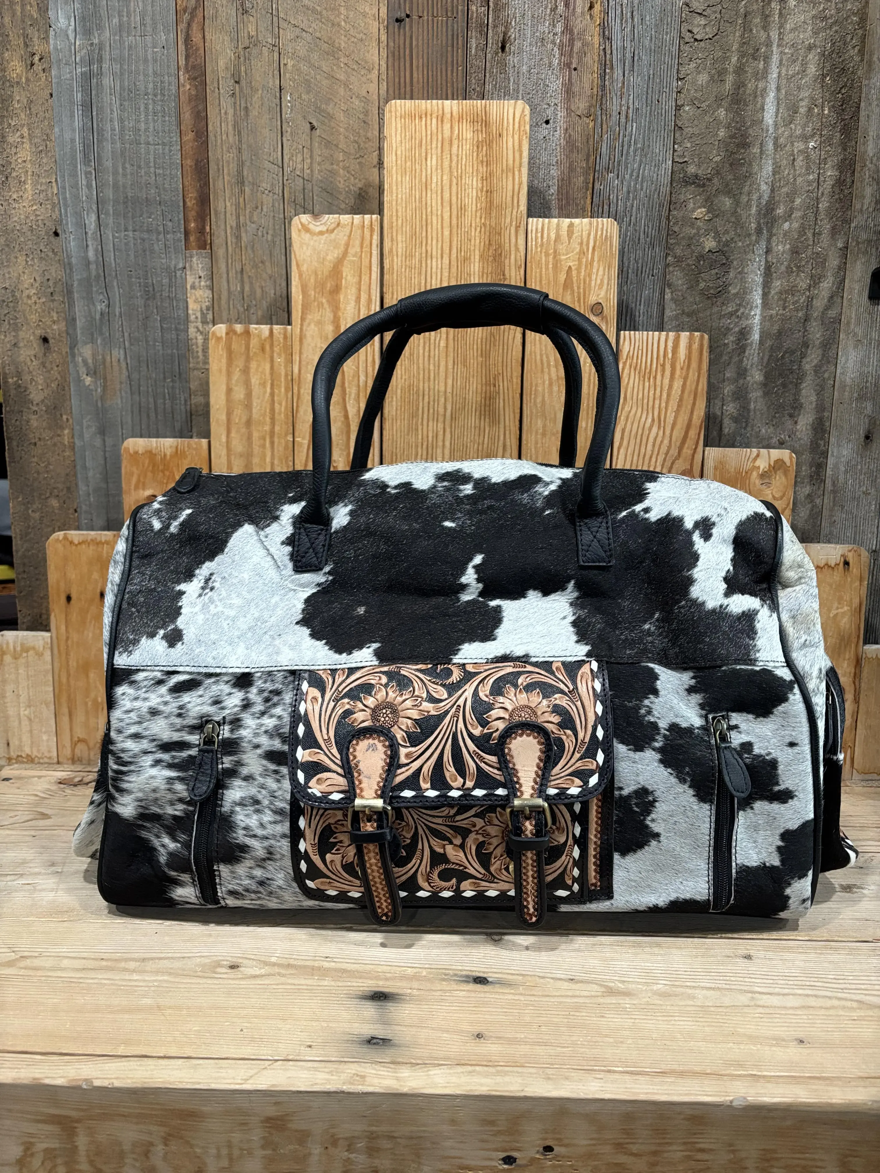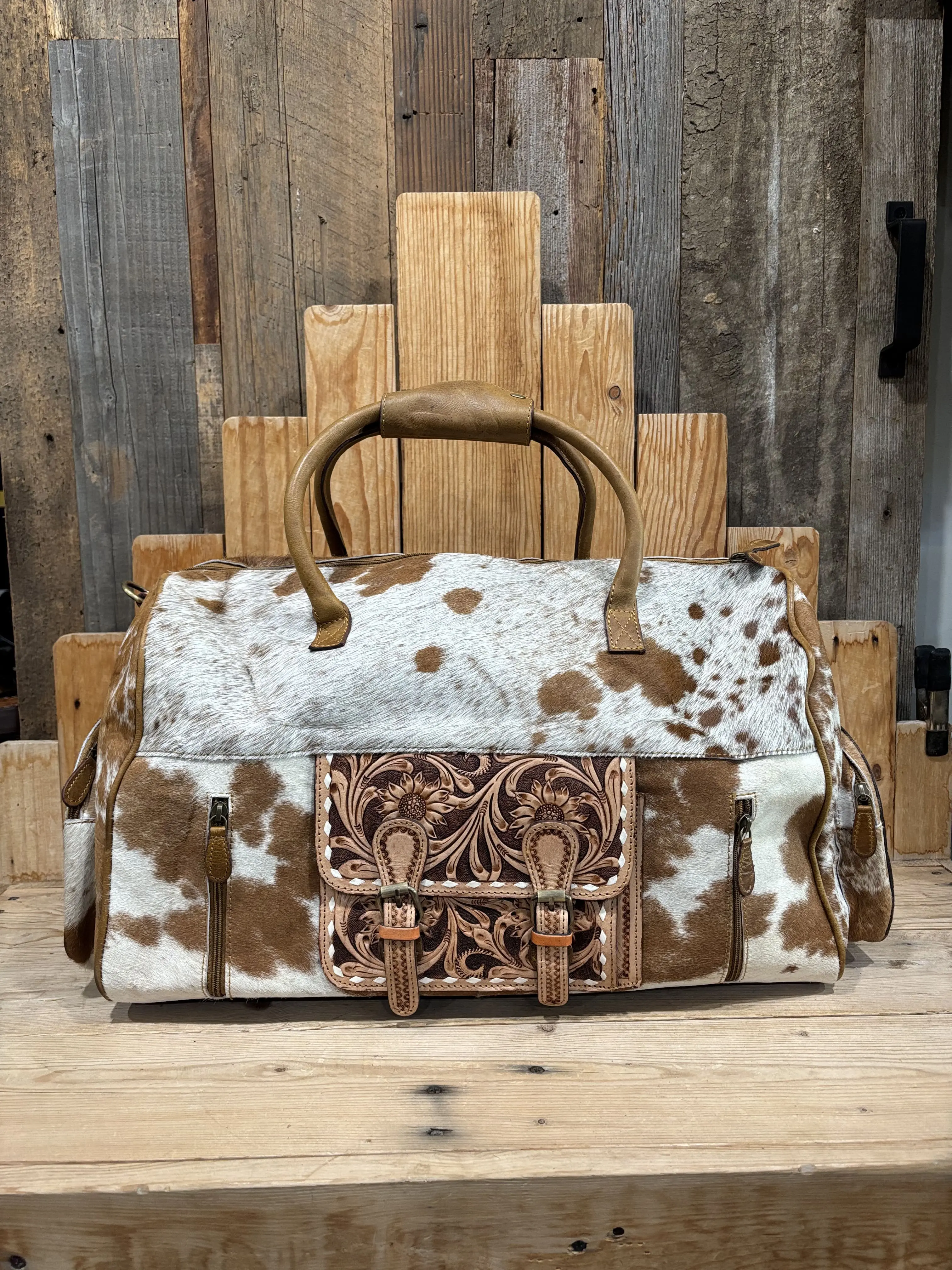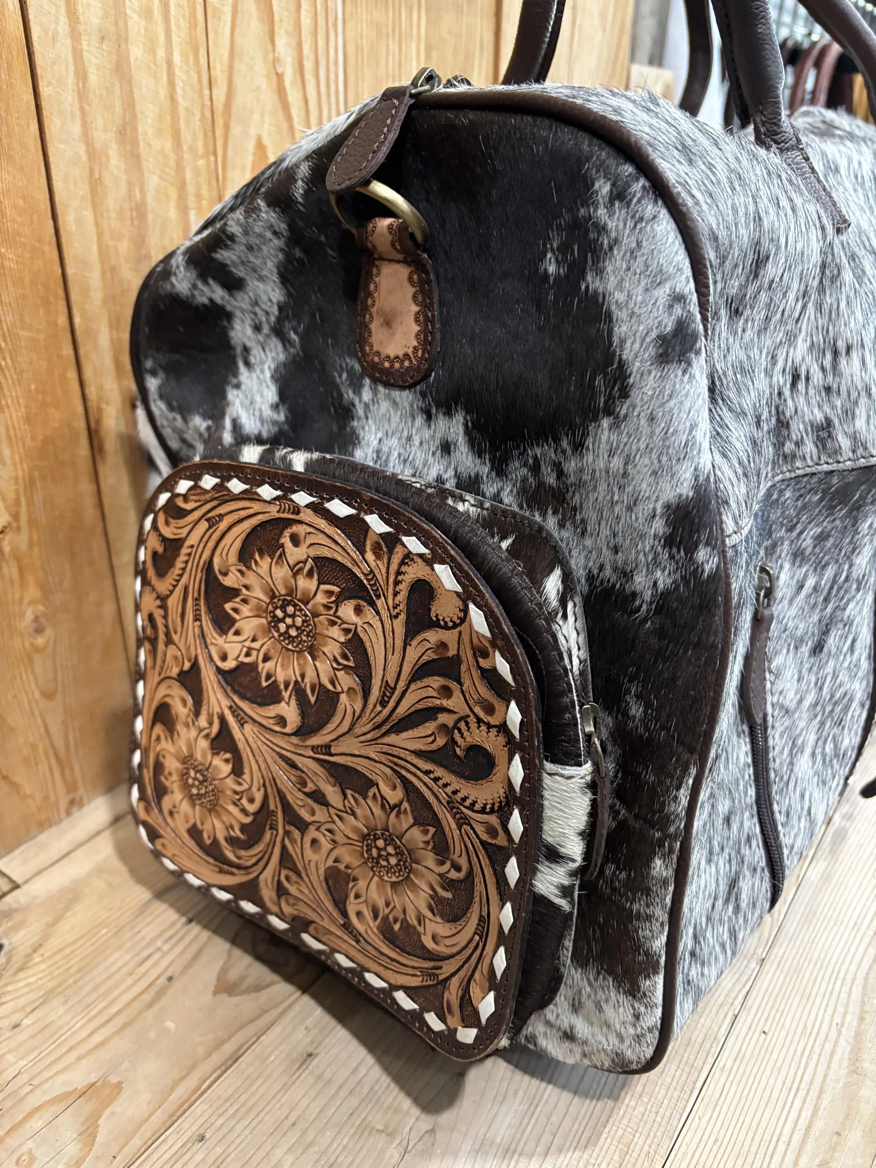 WOW this duffle bag is beautiful!! Genuine leather paired with cowhide & tooled leather accents. Zipper closure. Lots of pockets inside & out. Adjustable matching tooled leather crossbody strap. Great for traveling!!