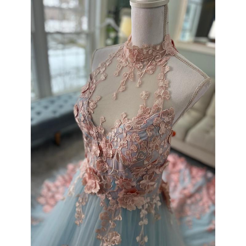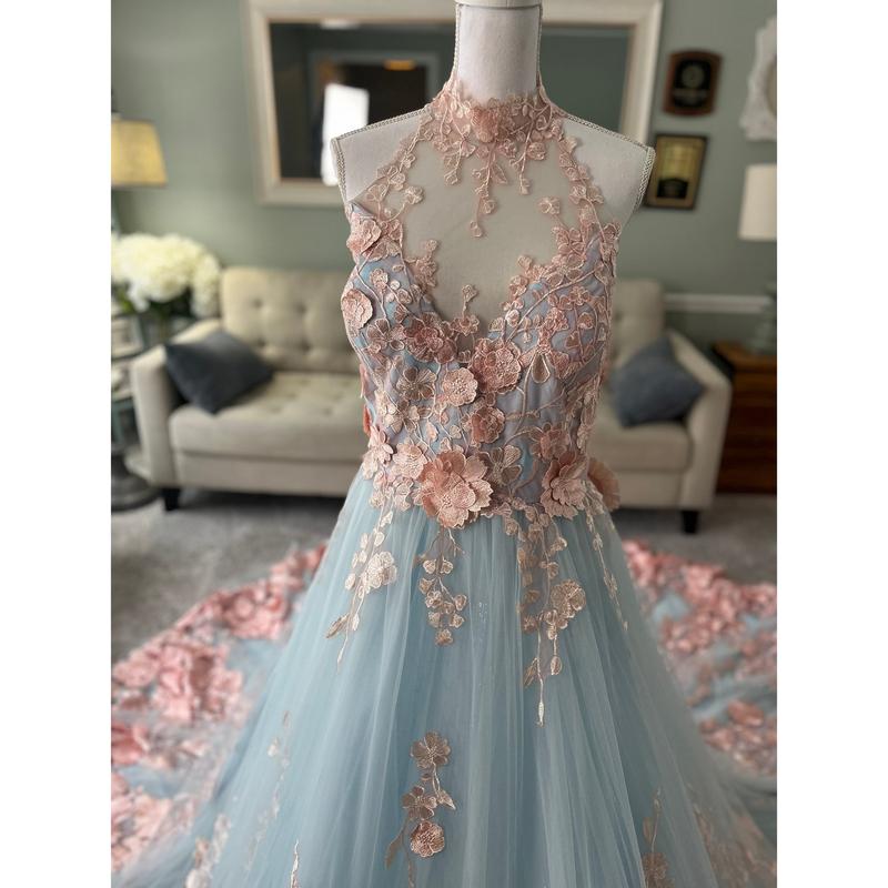 Our Katie Wedding Dress consists of blue tulle, blue satin and gorgeous 3D pink lace for a super whimsical bridal look. It also has a peak-a-boo neckline area, a halter neckline and is the perfect fairytale dress for your Disney Themed Wedding! It can be custom made in any size and color preferences.