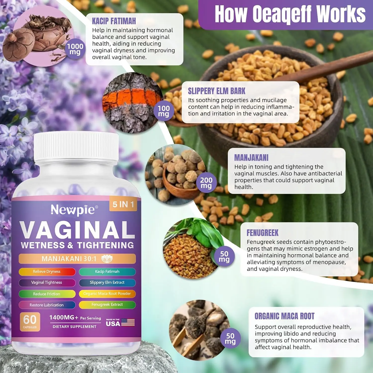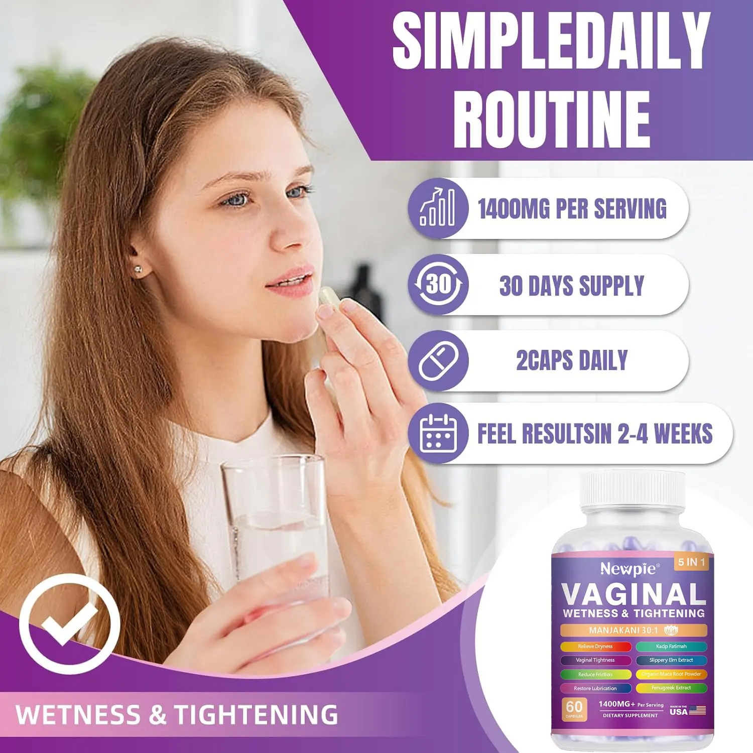 ·Effortless Use & Rapid Absorption:Featuring advanced time - release technology, these capsules ensure maximum ingredient absorption. Simply take 2 daily with water—no messy gels or creams. Experience visible improvements in vaginal wetness and tightening within a week.