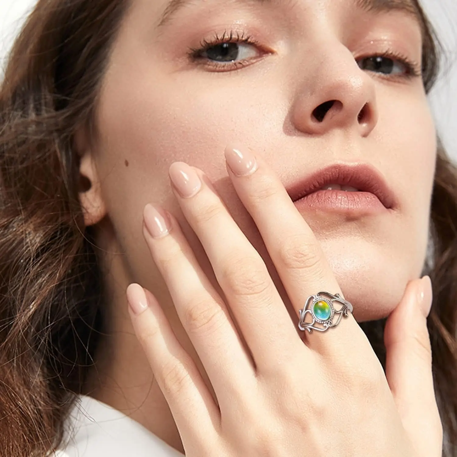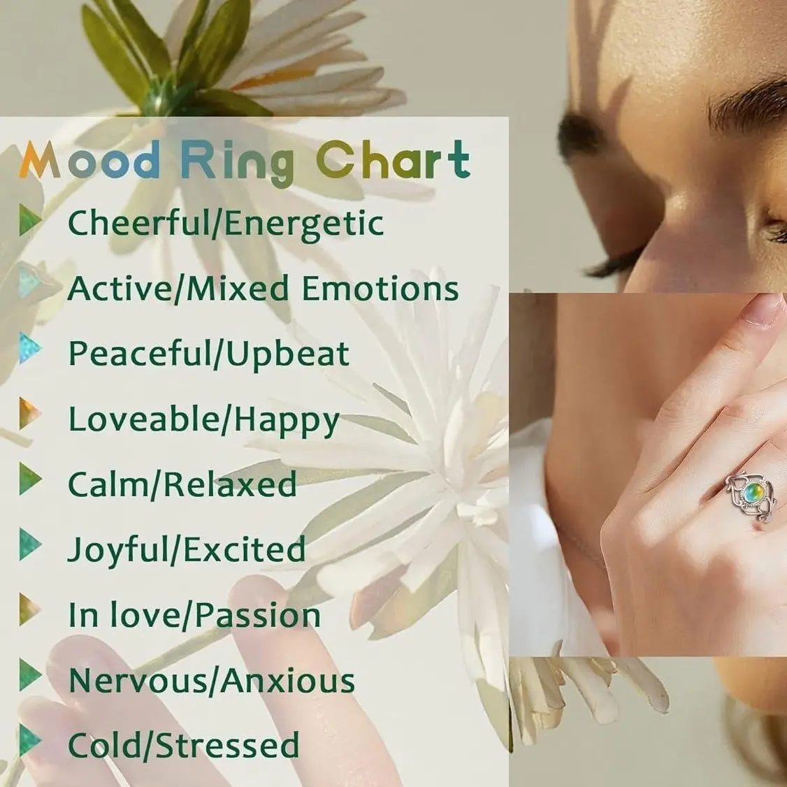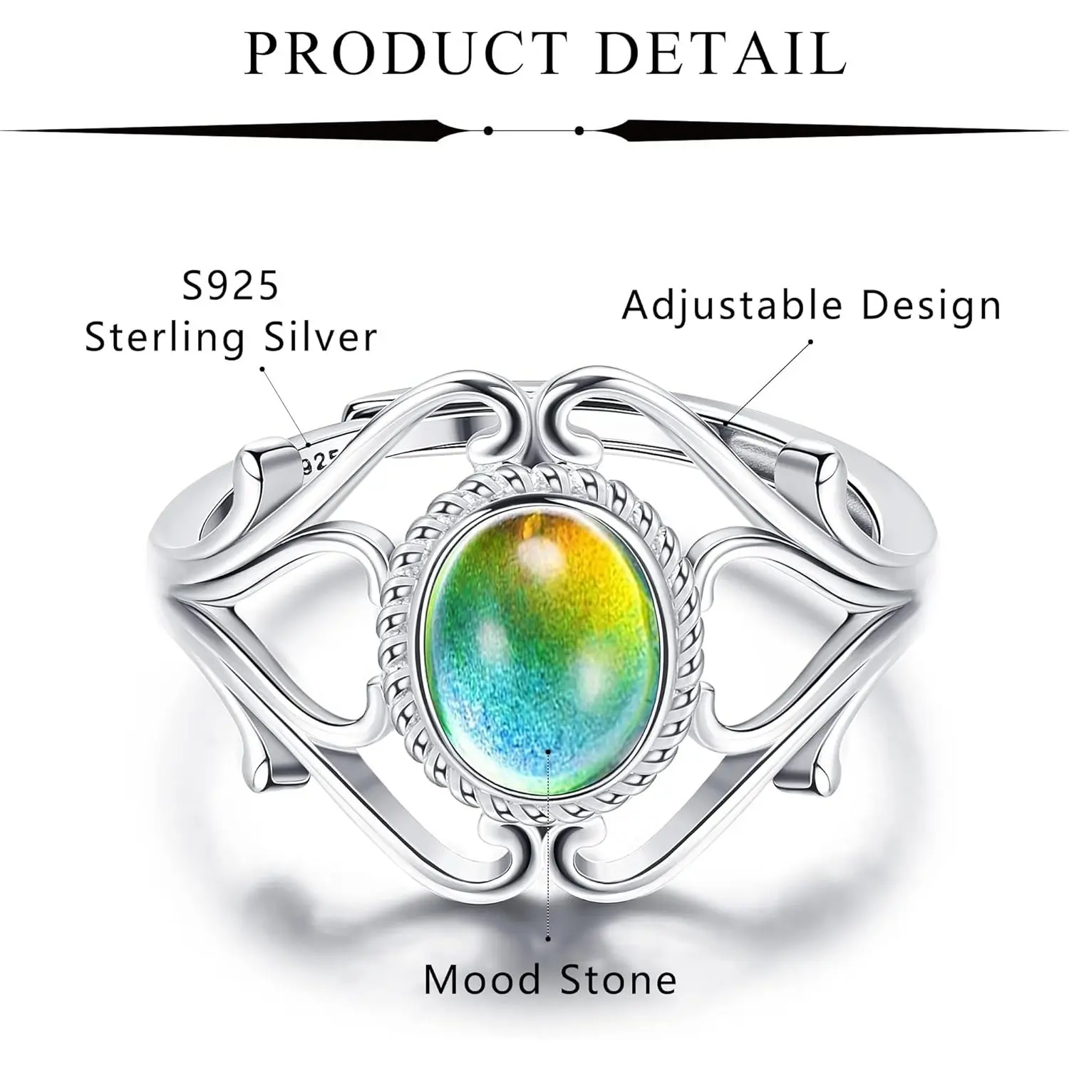 Bright color-changing acrylic mood stones are inlaid on high-polished long-lasting S925 sterling silver ring settings, Which can add beauty and charm to any outfit. This ring can be worn alone or with other fashion jewelry as a stacking ring to create a truly elegant look. Mood stone rings can change color in different environments, which can relieve anxiety and relax your mind.