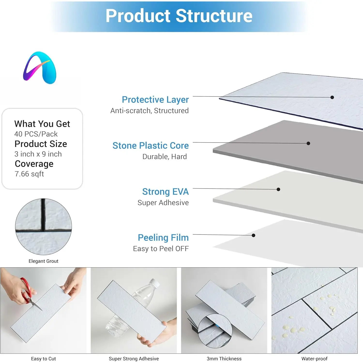 **Cool Design**: The 3x9 inch size is eye-catching, and the white slate with black grout makes it pop, covers 7.66 square in one pack. You can find at least 150 random patterns in the peel and stick tile. The diverse design looks more like stone. Meanwhile, it gives off a modern vibe that's sure to impress.