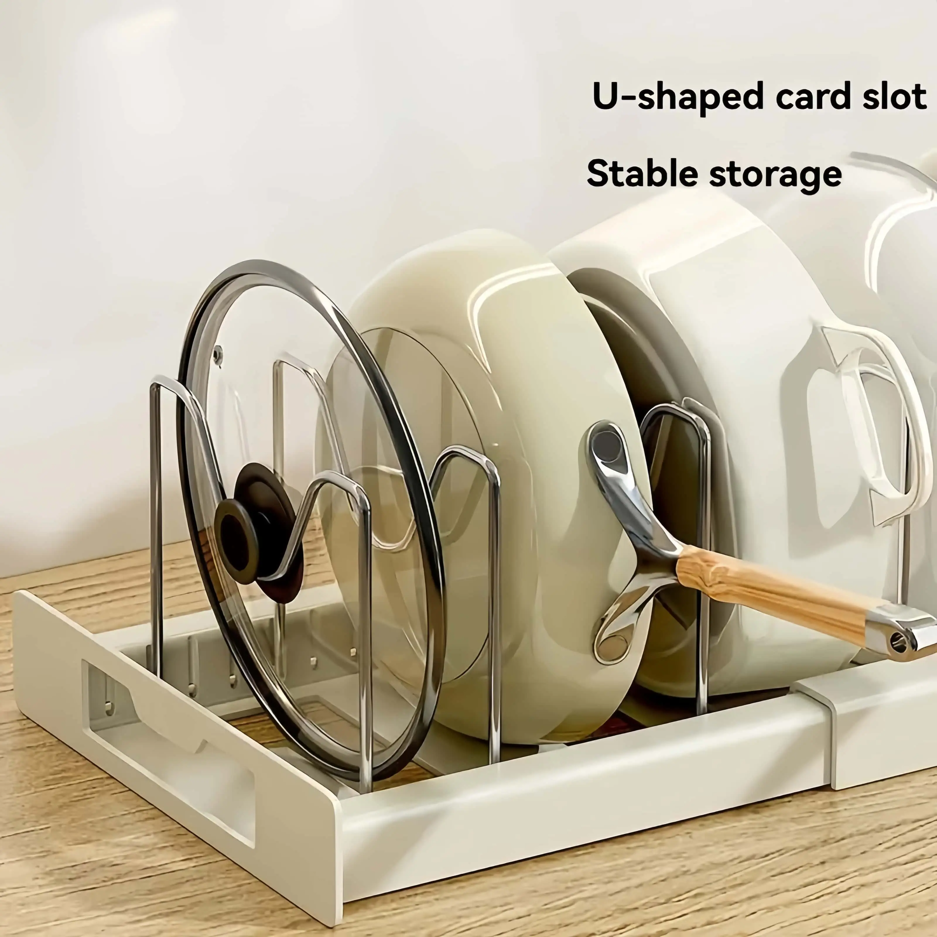 ·This space-saving pull-out kitchen organizer is perfect for pots and pans. It features an adjustable metal pot lid holder, ensuring convenience and organization. The rack is designed to fit various sizes of pots and lids, making it a versatile addition to any kitchen.