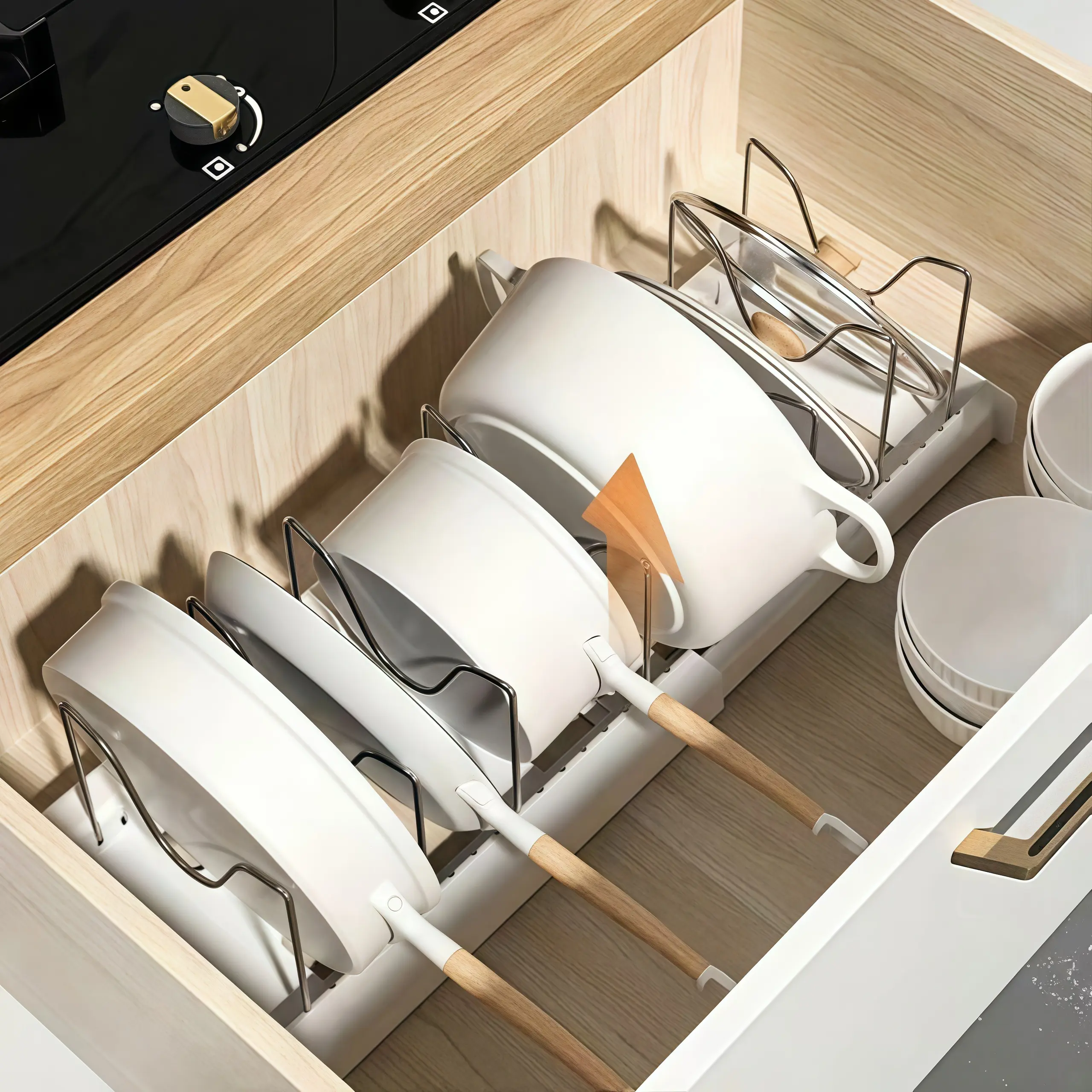 ·With this pull-out organizer, you can easily store and access your pots and pans. Its adjustable design allows for flexibility in fitting different-sized items. Keep your kitchen organized and clutter-free with this practical storage solution.