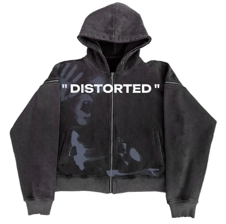 Step into the static with the “DISTORTED” Zip Hoodie — a bold clash of shadow, shape, and raw minimalism. This heavyweight black hoodie features a ghosted face graphic warped into the fabric like a visual glitch, layered beneath stark white "DISTORTED" type across the chest.