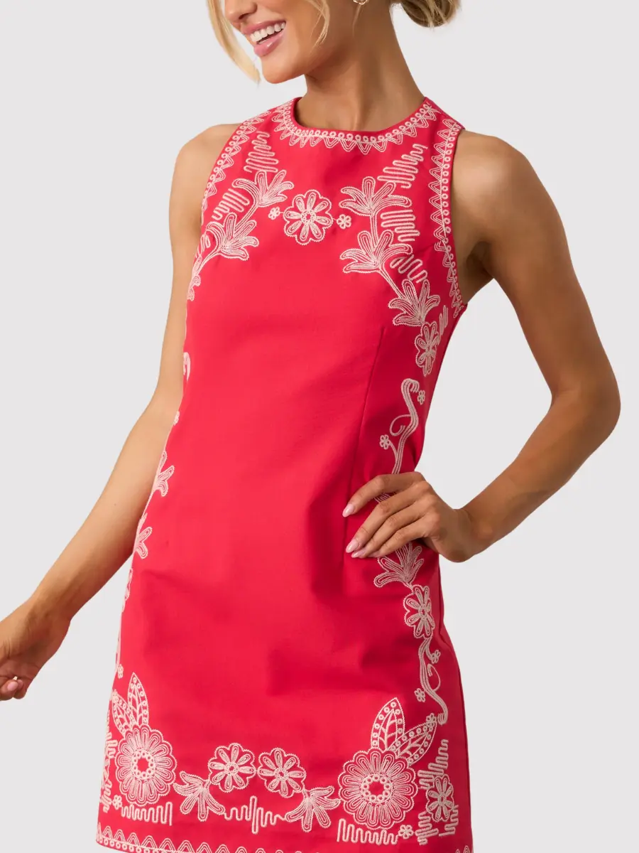 Elegant and versatile, this red mini shift dress features delicate white embroidery on the top. Perfect for any occasion, it will add a pop of color and a touch of sophistication to your wardrobe. Dress it up or down, and feel confident and stylish wherever you go.