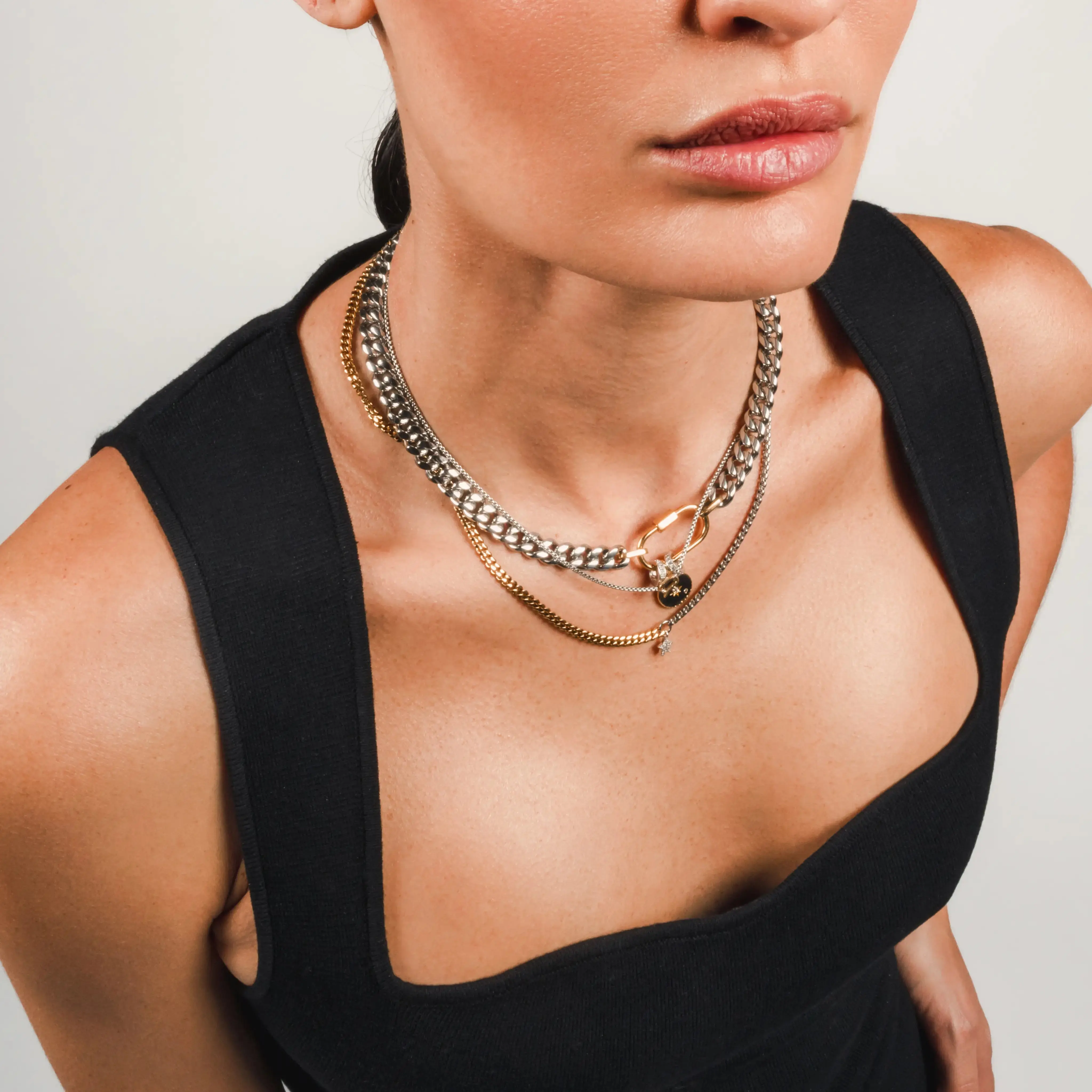 ·Rhodium Plated Stainless Steel with 18K Gold Plated Stainless Steel Sleek Carabiner Clasp with charms-