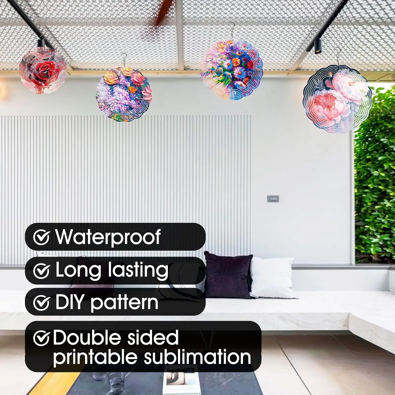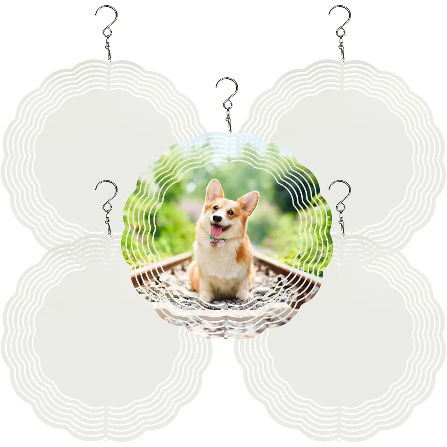 【Package Contents】You will get 5 pack of Sublimation Wind Spinner blanks and 5 hooks. The size of each Wind Spinner Blank is about 8 inches. These Wind Spinners can be for double-sided sublimation and DIY your favorite patterns.