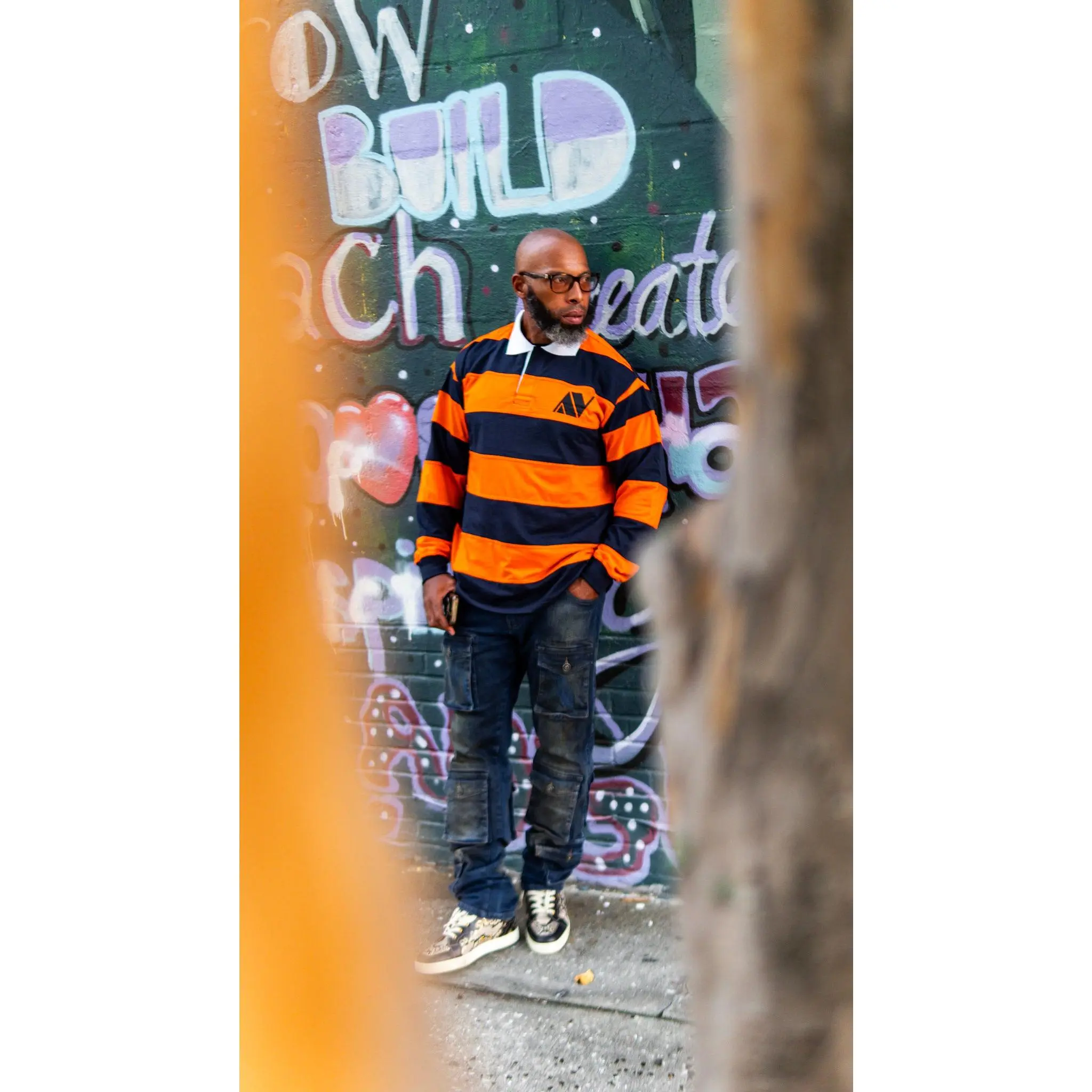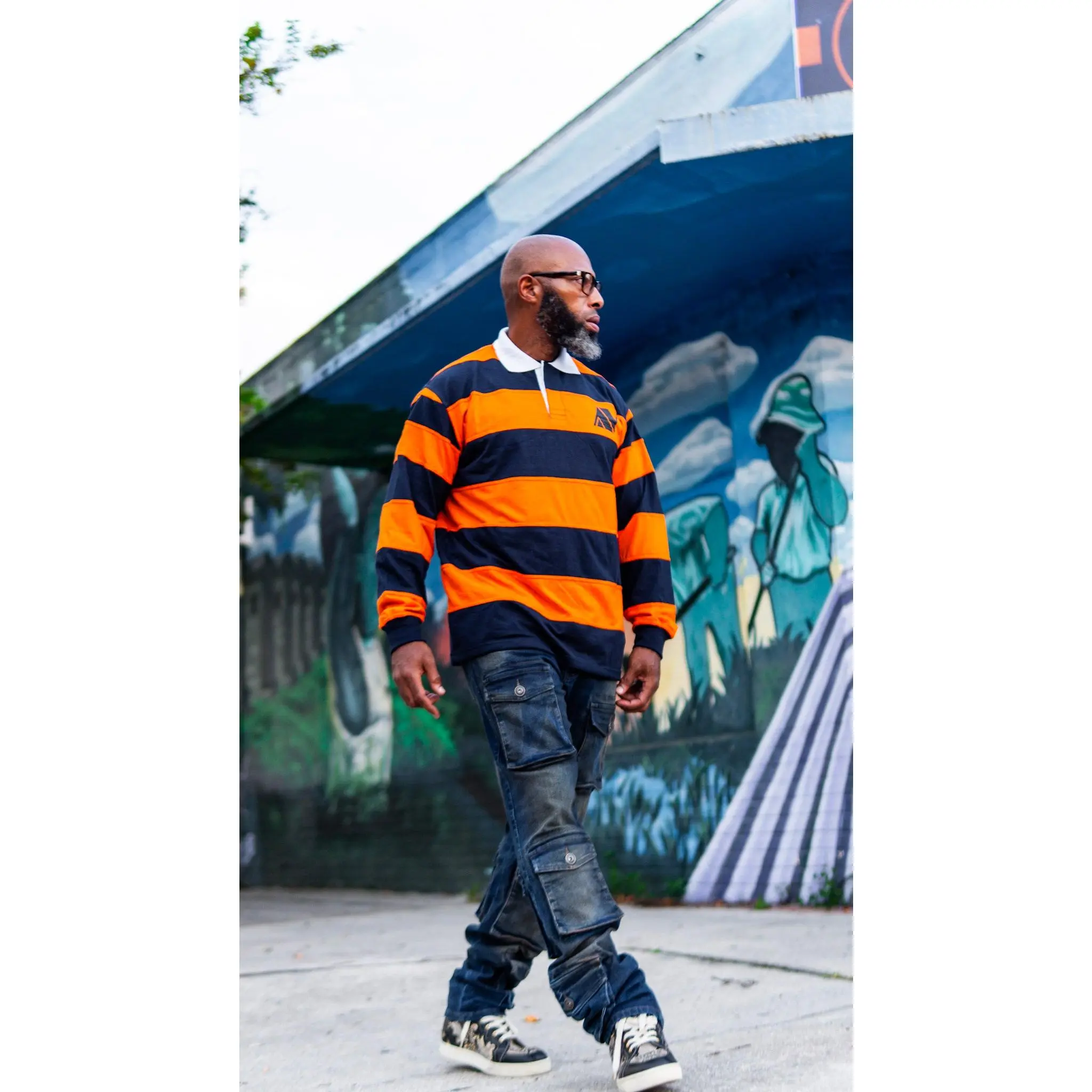orange and blue stripes with white collar and AV logo