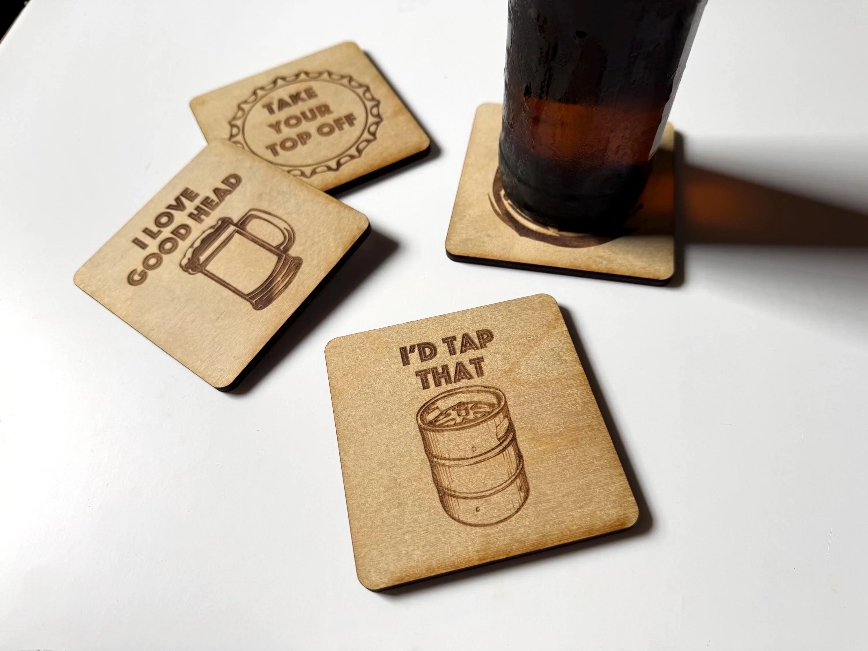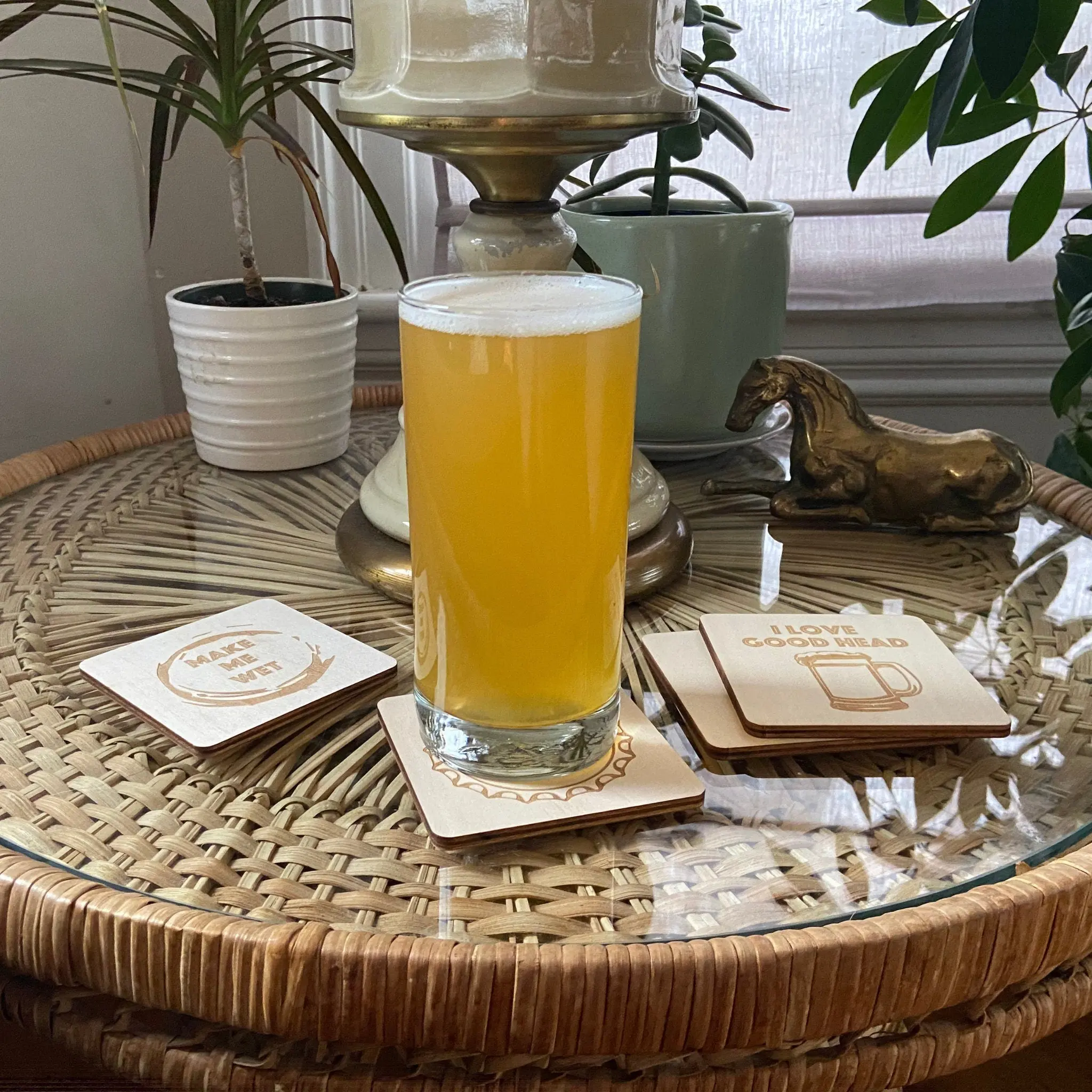 Bring some bold humor to your bar, brewery, or man cave with this set of 4 laser-engraved wooden drink coasters featuring cheeky, beer-themed puns. Whether you’re pouring pints at home or stocking tables at a taproom, these coasters are a fun way to protect your surfaces and keep guests laughing.