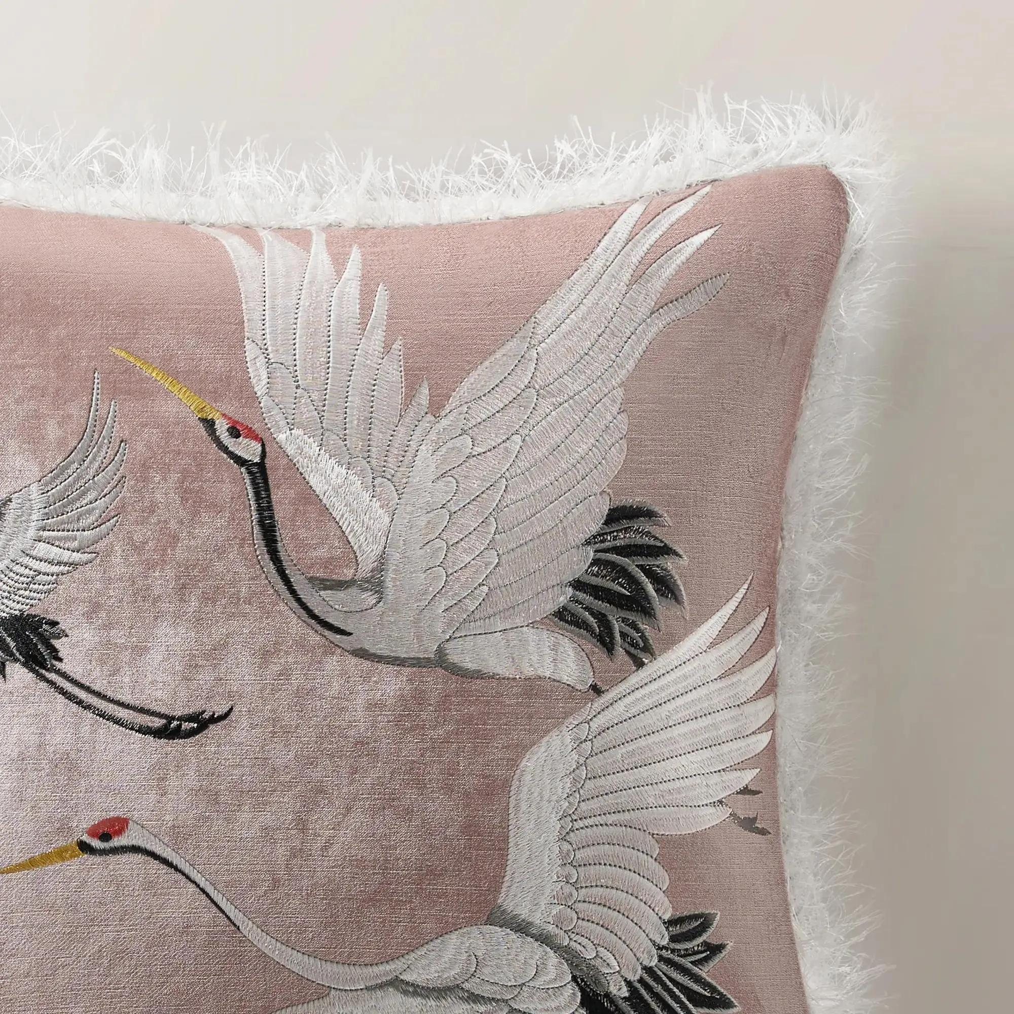 Create an artistic focal point with our Crane Embroidered Pillow. Delicate crane motifs are expertly embroidered on luxurious dusty rose velvet, while playful eyelash fringe adds whimsical movement.